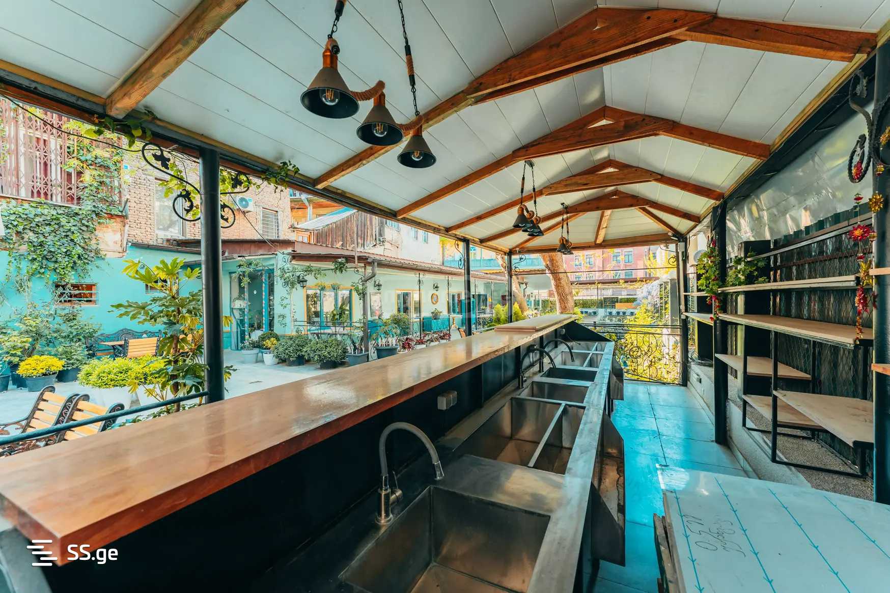 The total area is 472 square meters, including an outdoor space with its greenery. It has been newly renovated, with two restrooms, and includes an open bar with full kitchen equipment.
