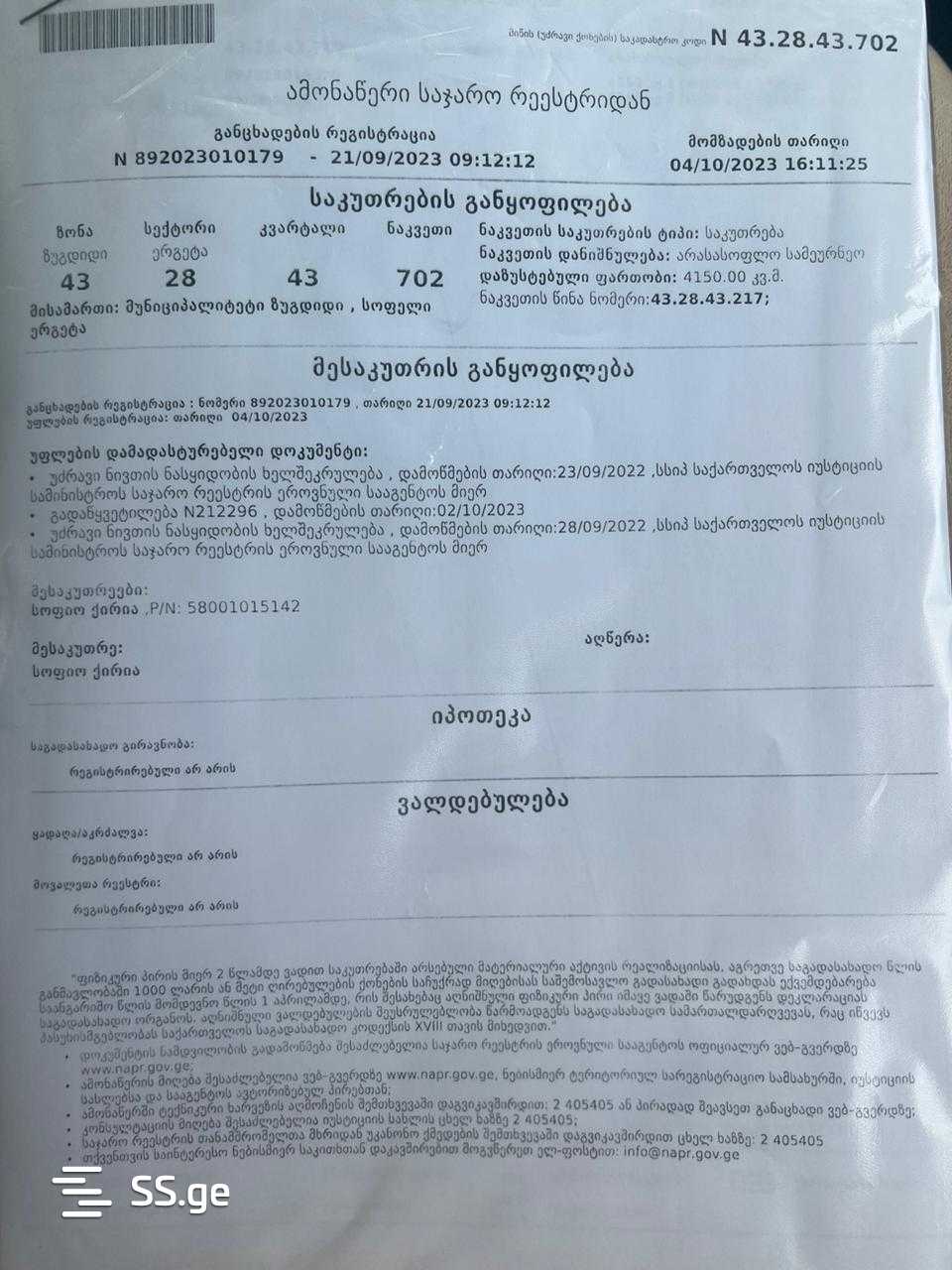 A plot of non-rural land in Zugdidi district, Ergeta village, is urgently for sale. It is also possible to divide. Electricity, water, gas, road are brought to the plot. The plot of land is suitable for cottages and storage.