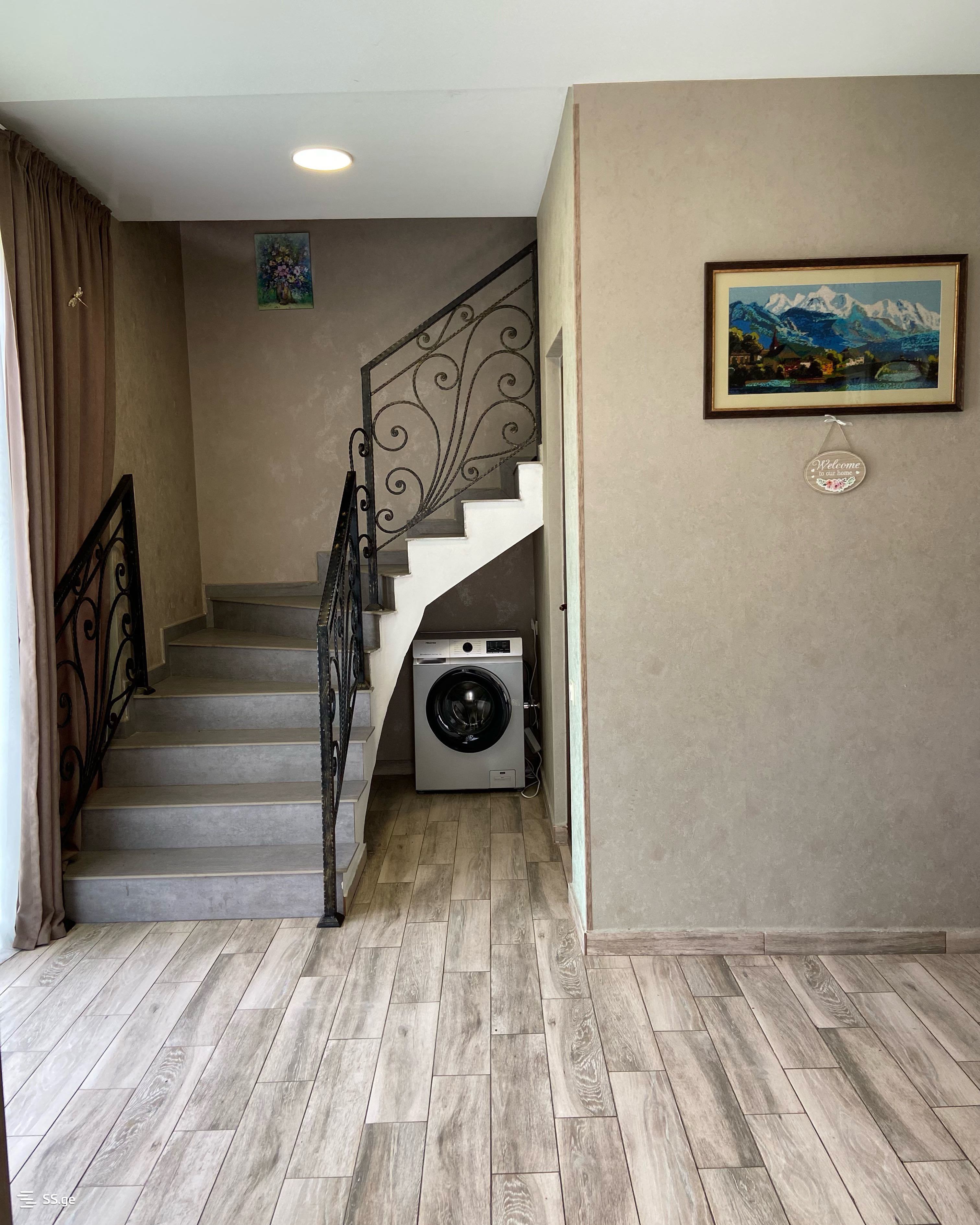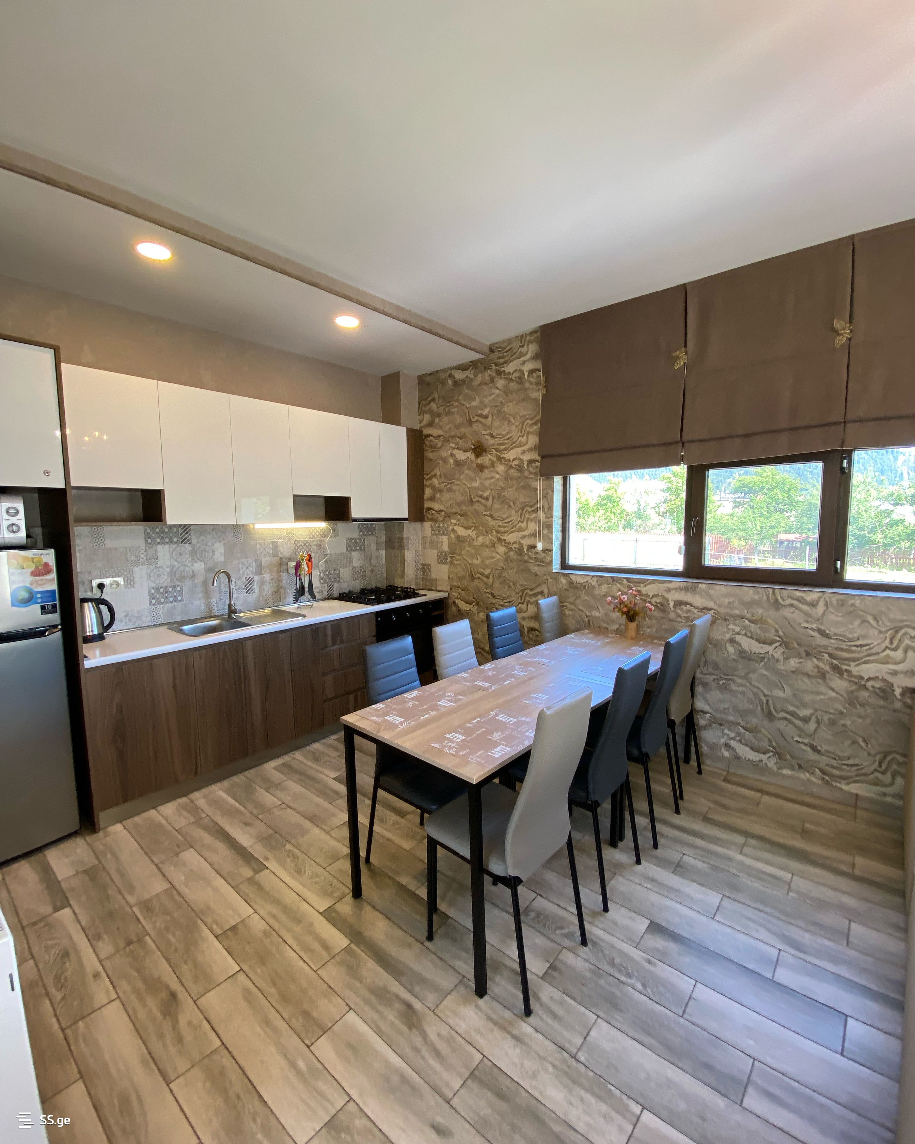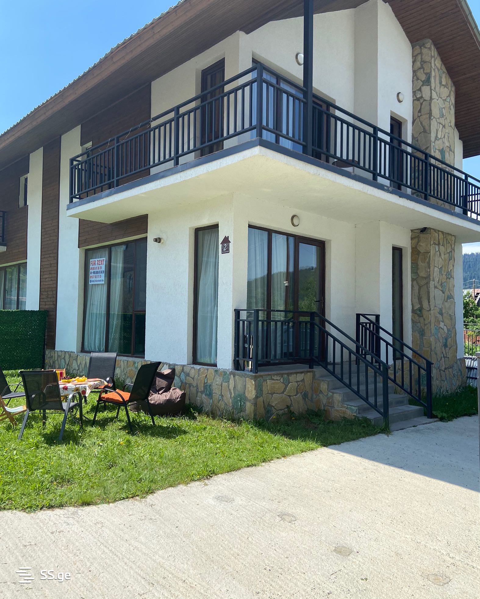 A newly built cottage is for rent near Central Park, isolated, with a secured yard, garden furniture in the yard, a children's play area near the yard, 2 bedrooms, individual wet rooms, a living room with a fireplace, all necessary equipment and inventory. The yard has a barbecue zone. The price is 200 GEL, and a discount applies for long-term rentals.