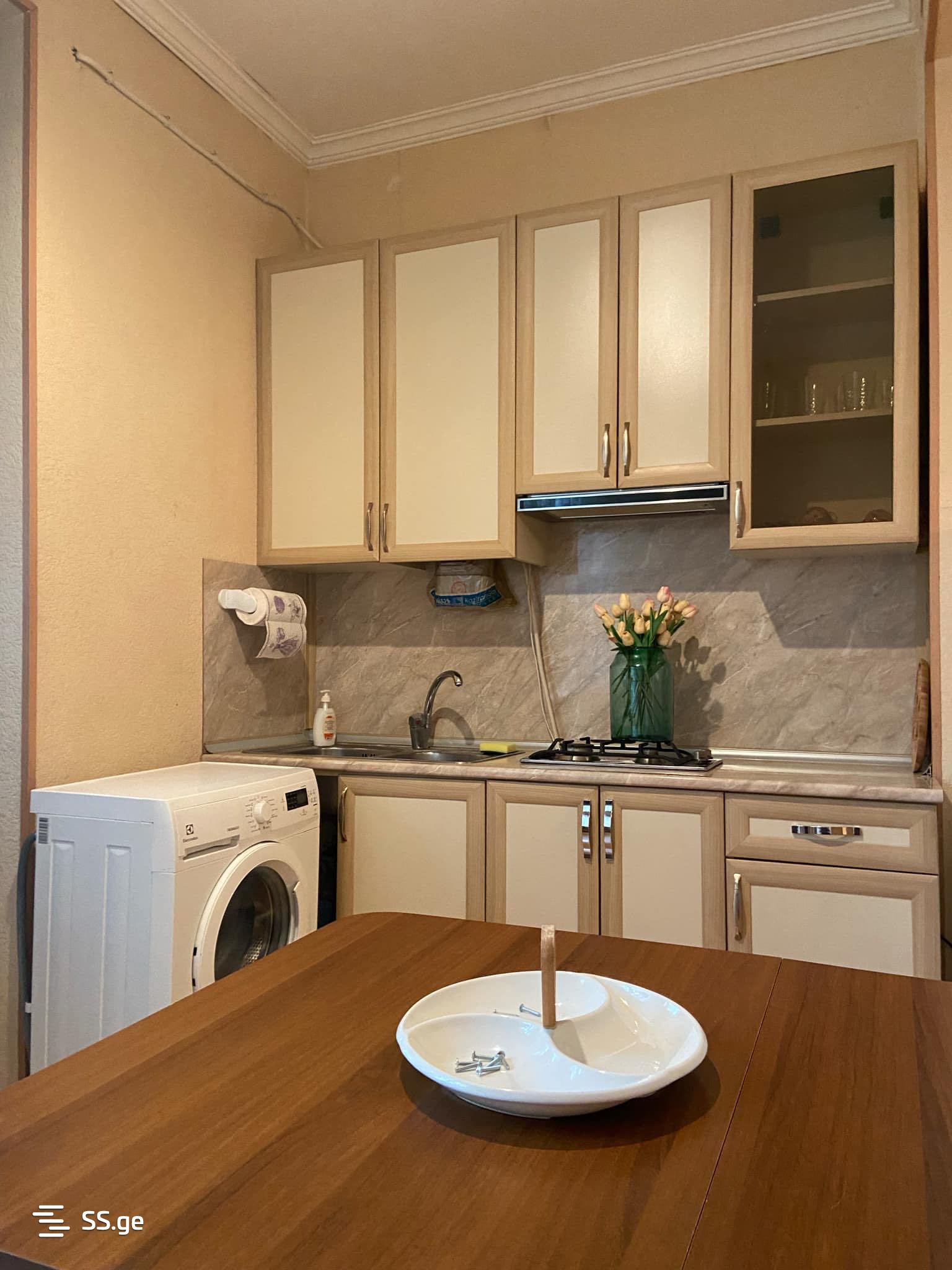 The apartment is located opposite the Mushtaidi Park, next to Dynamo. The apartment is clean and well-maintained, looking for a good temporary tenant who will keep it clean. It has a large yard with greenery and is a quiet living place. The Tserehteli Metro is a 5-minute walk away. It is equipped with household appliances and furniture.