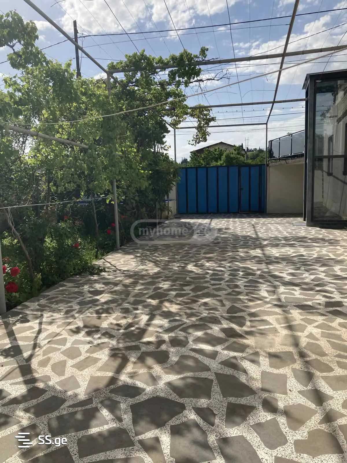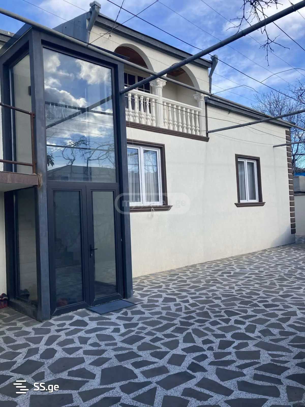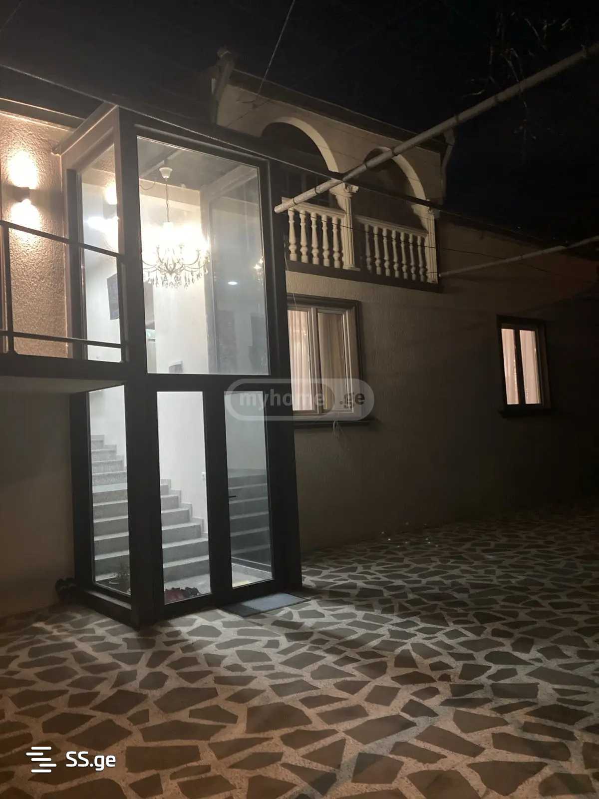 A two-story private house for rent in Gldani, with three bedrooms, a living room, a kitchen, a dining room, two bathrooms, a garage, a basement, and there is a swimming pool and fruit trees in the yard.