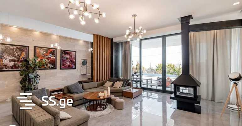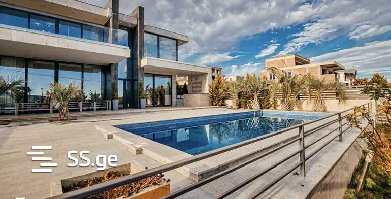 The villa features a swimming pool, garage, and terrace with beautiful views of Tbilisi. It is furnished with high-quality furniture and appliances, ensuring maximum comfort and functionality.