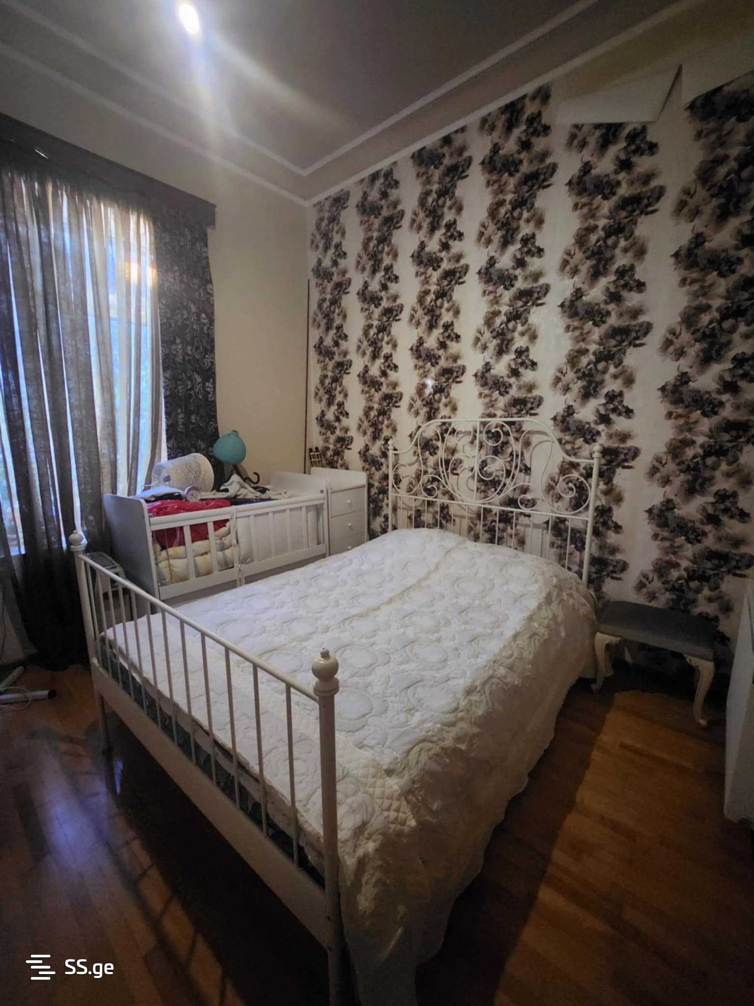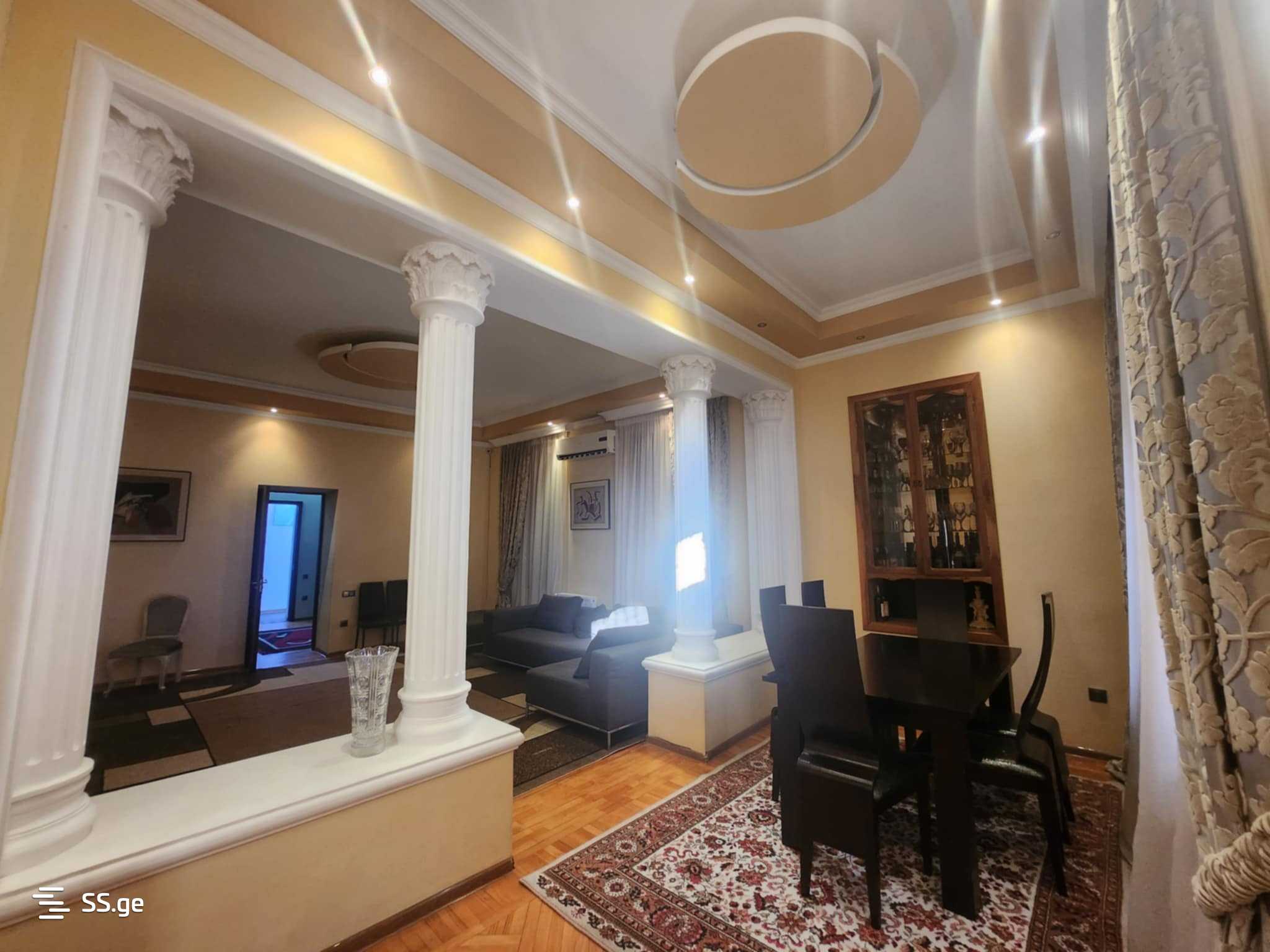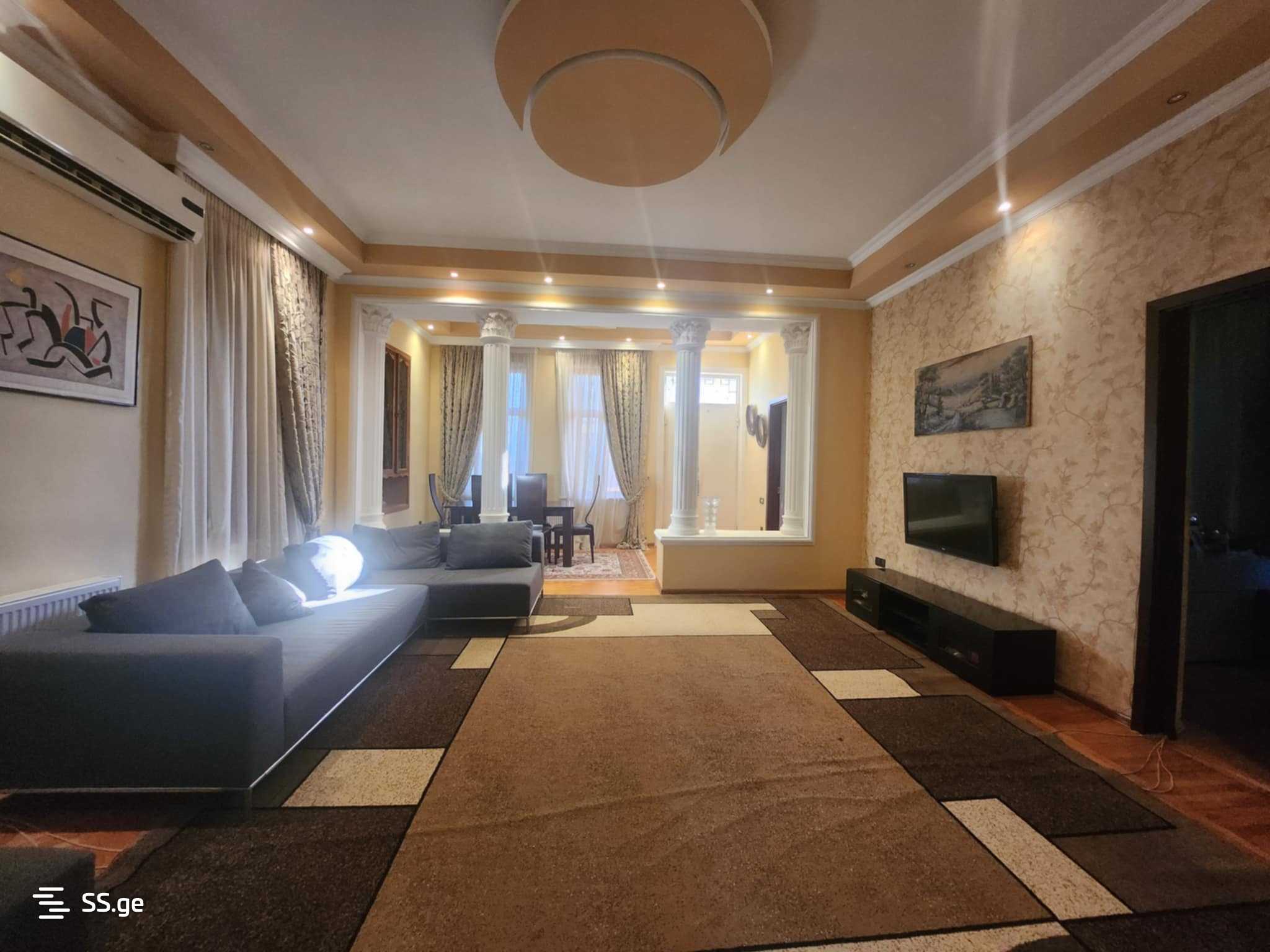 Private house for rent in Kutaisi on Kldiashvili Street. The house is on the first floor. Independent. Renovated. With central heating. With furniture and appliances. Living room 1. Hall. 3 bedrooms. Isolated kitchen. 2 bathrooms. 1 balcony. Yard: 680 sq.m. House: 220 sq.m. Price: 1600 GEL.