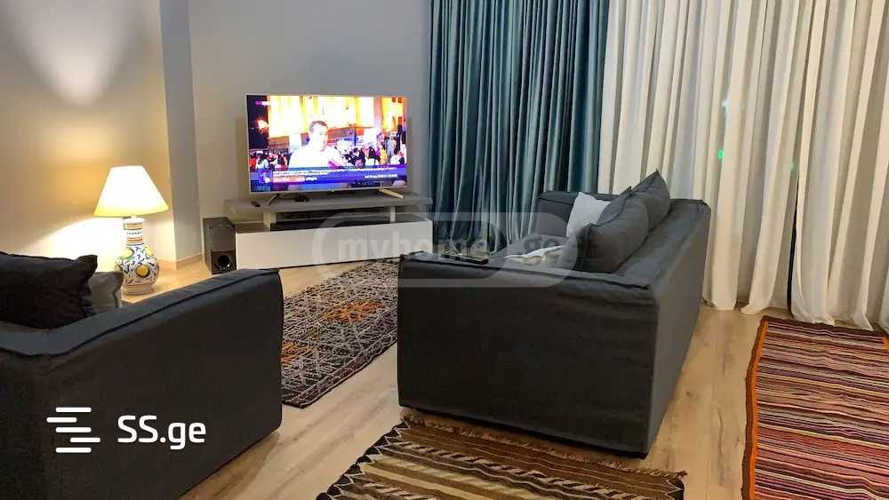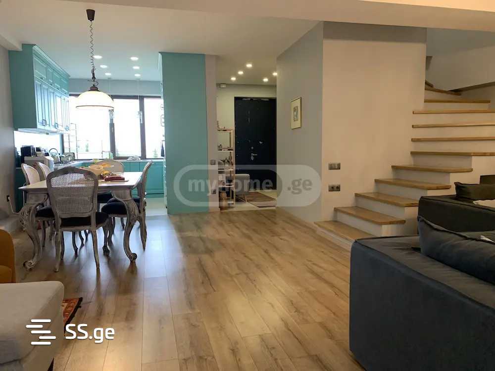 The house is located in a gated and secured private community of 30 houses. It has all utilities including Tbilisi water. The house is a type of Town House with a small private yard and a large shared green garden with trees. Of the three bedrooms, one is a Master Bedroom with its own bathroom and two wardrobes (one for each spouse).