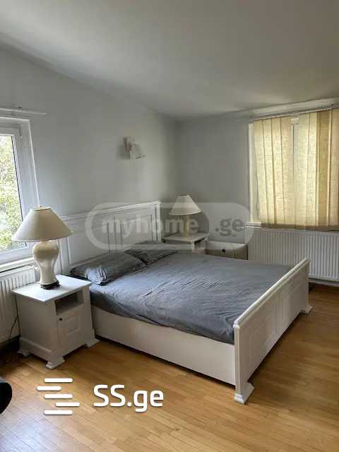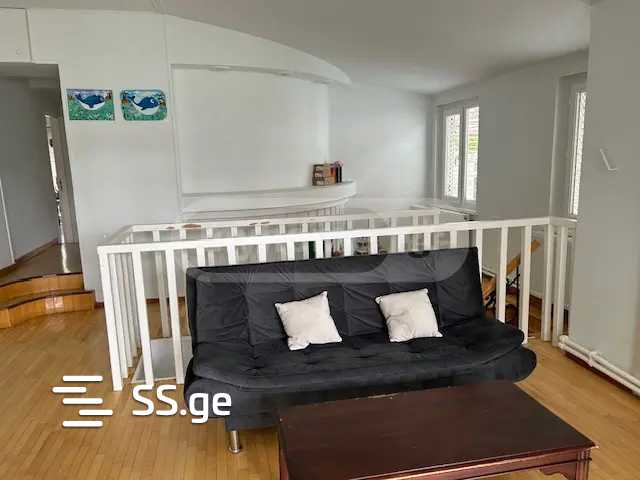 For rent: 2-story apartment, total area of 210 sq.m, part of a private house. (See attached floor plans). 5 rooms, kitchen, and veranda, sauna. Furnished. Air conditioning in every room. Green yard with flowers and fruit trees, barbecue area, chairs, and table in the yard.