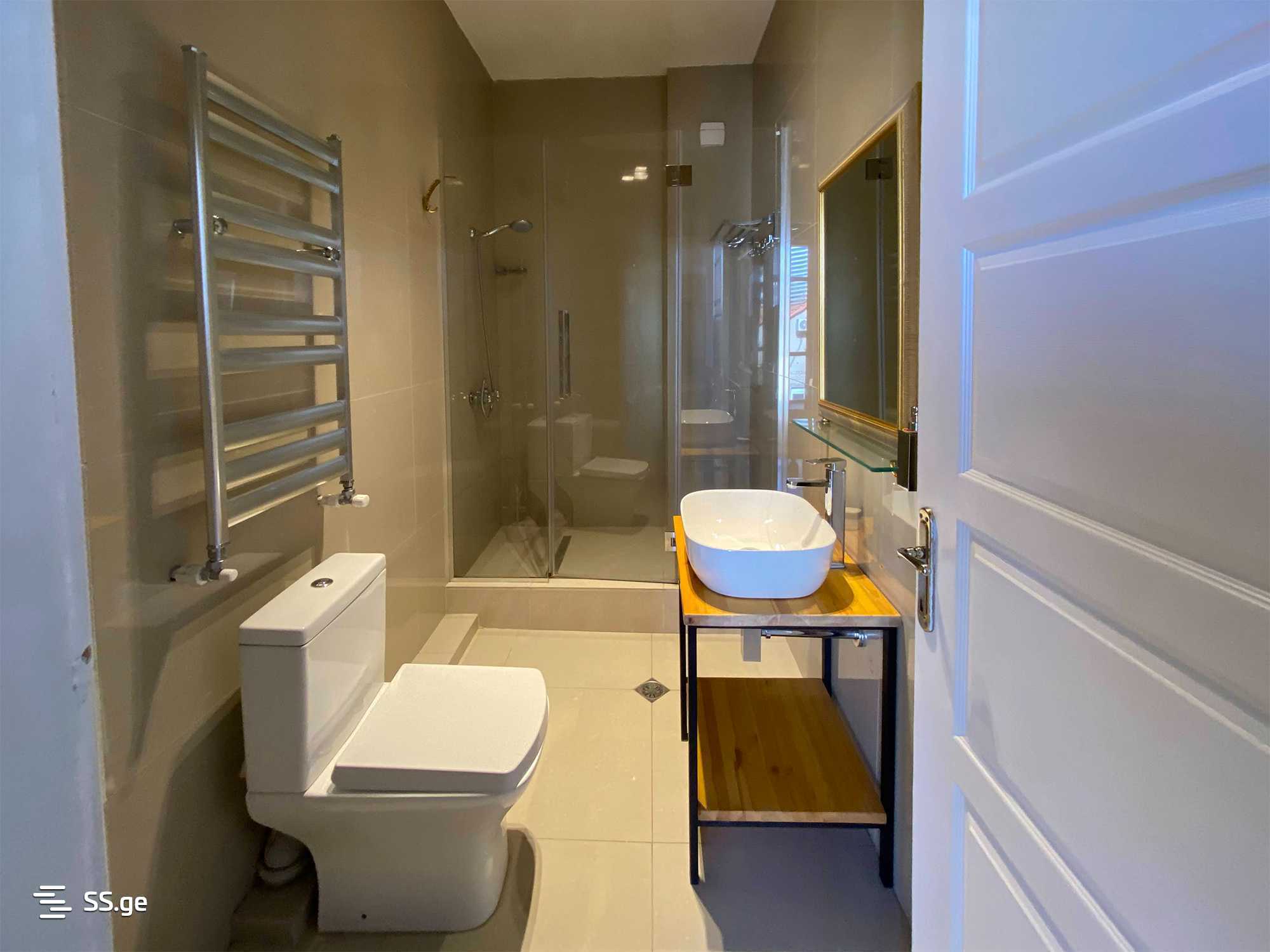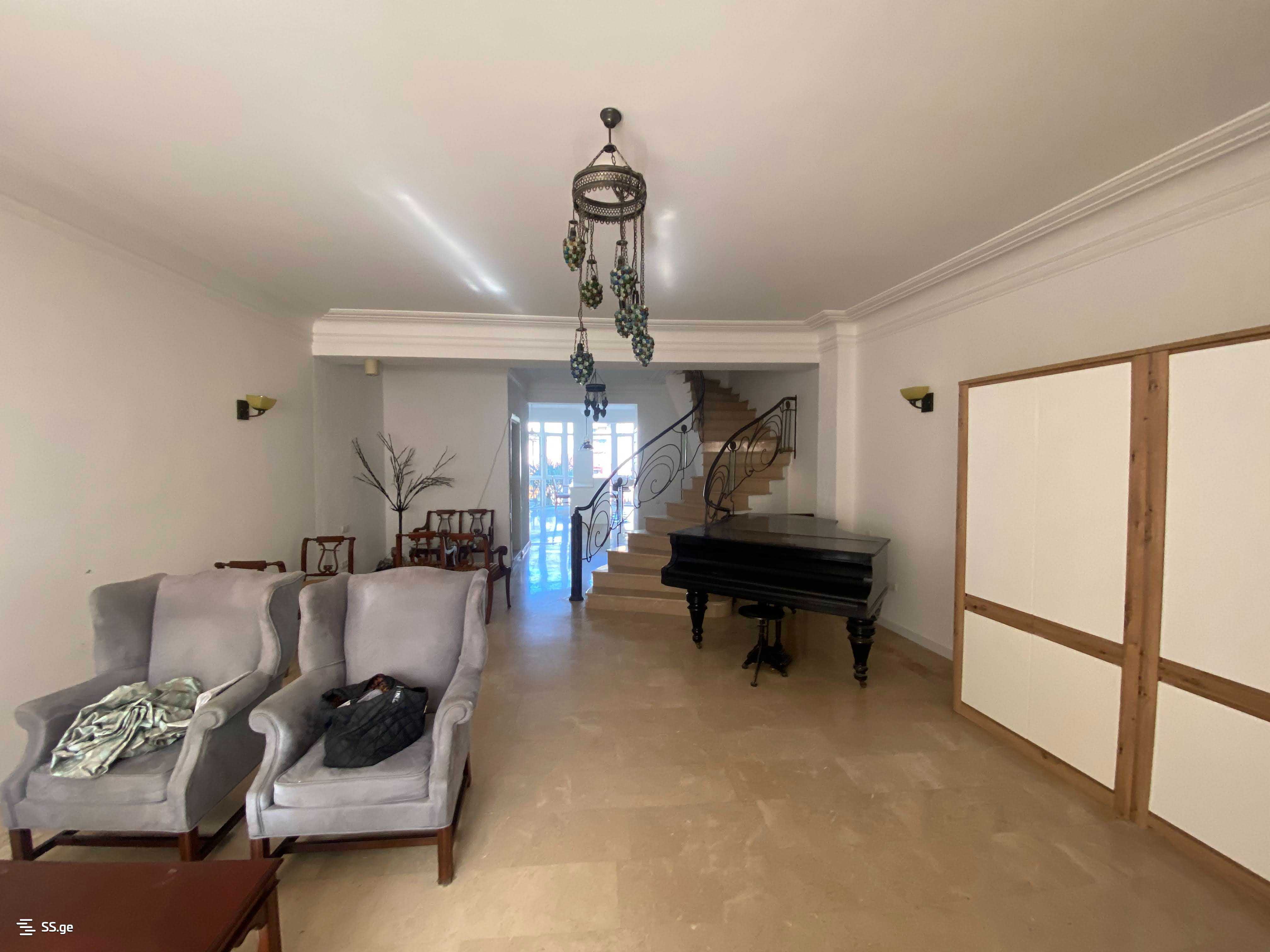 For rent or for sale. The house is suitable for a hotel, office, or large family living. It is located in Vake Park, has a yard, terrace, and good views.