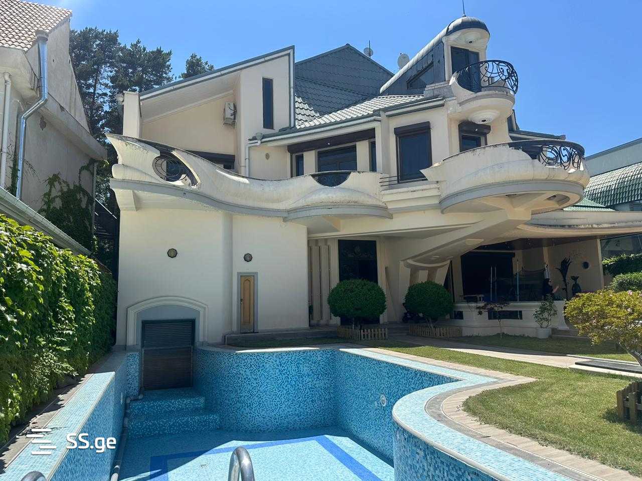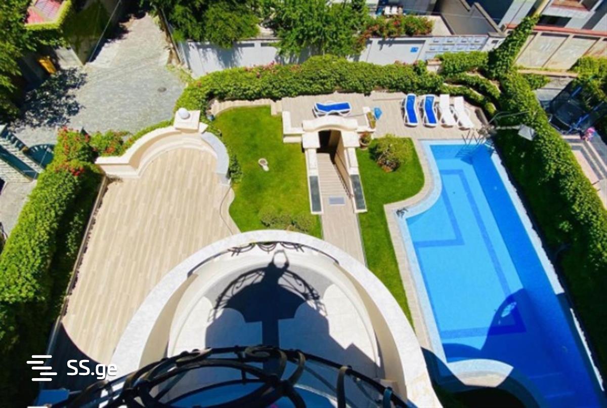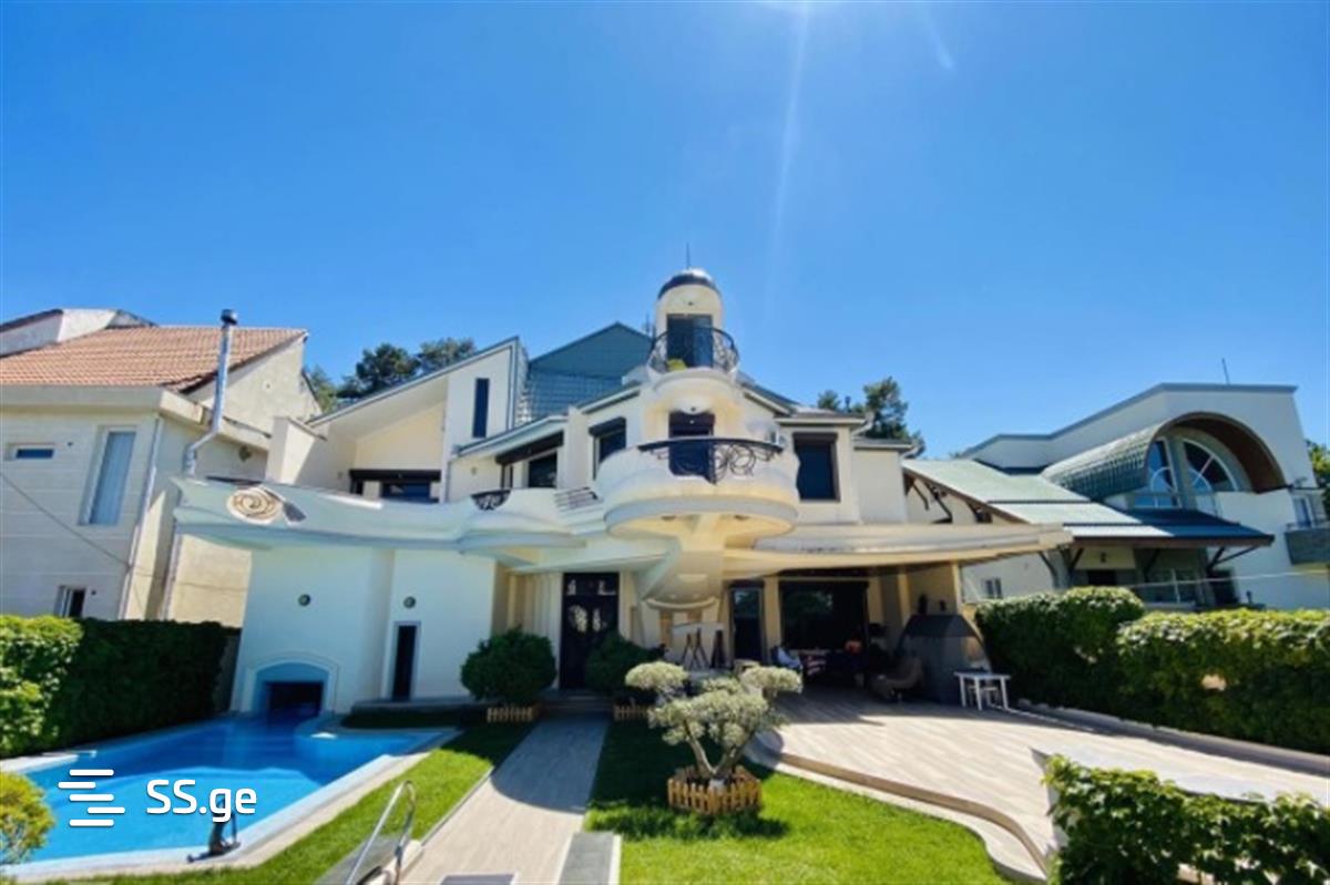In Tskneti, a private three-storey residential house for sale, with a total area of 951 square meters, with its own yard, swimming pool, which has access from the dressing room and shower room located inside the house. The house is located on the edge of the government cottage area, it has direct access to the area's multi-acre park space. The house has its own garage for 8 cars. The house has 5 bedrooms with their own closets. Three of these bedrooms are duplex type, with independent living room, bedroom, balcony and bathrooms. There is one more master and one guest bedroom in the house. The house has 2 kitchens, a library, a cabinet, a wardrobe, living spaces, 9 bathrooms, 2 fireplaces, 1 terrace (90 sq. meters) and 5 balconies. Bronze products are used in the interior and exterior of the house. The price is 1,250,000 USD