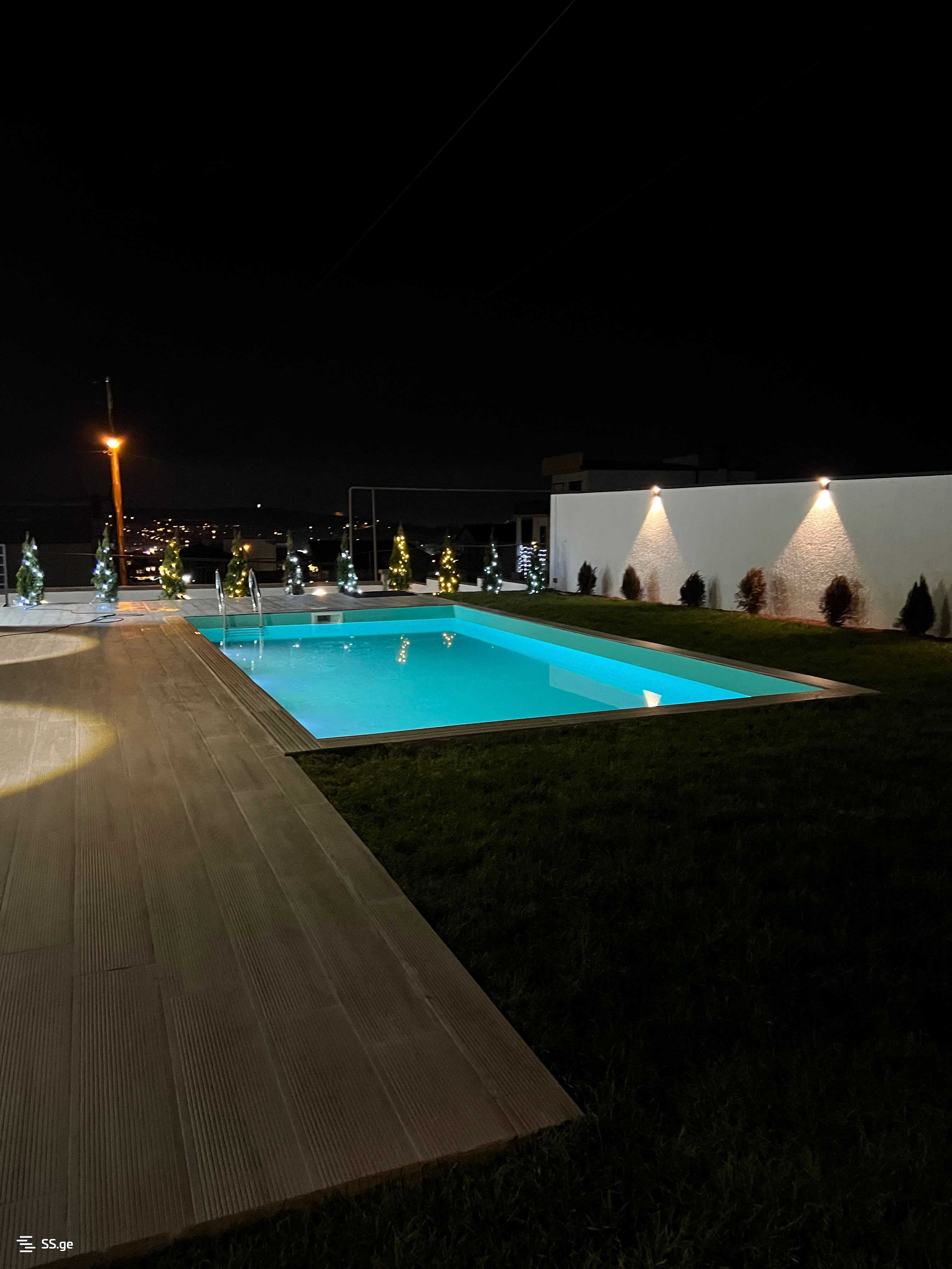 For sale 500 sq.m. house in Ivertubani, with a basement and a heated pool, on the first floor there is a living room, a kitchen, one bedroom. A bathroom with a jacuzzi and kitchen appliances (refrigerator, gas. hood, dishwasher. microwave oven and oven) on the first floor with underfloor heating, on the second floor there are 4 bedrooms with three bathrooms (two of which are master bedrooms), a separate laundry room with a washing machine and a communication room, in the basement there is a large party hall, where a kitchen with appliances is installed, a bathroom, a cinema room and a large storage room, it is possible to enter the basement both from the inside and from the yard. Video surveillance cameras are installed, the green cover in the yard is watered by computer systems, a pool, which is also heated in winter.