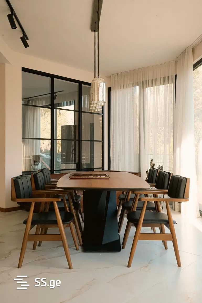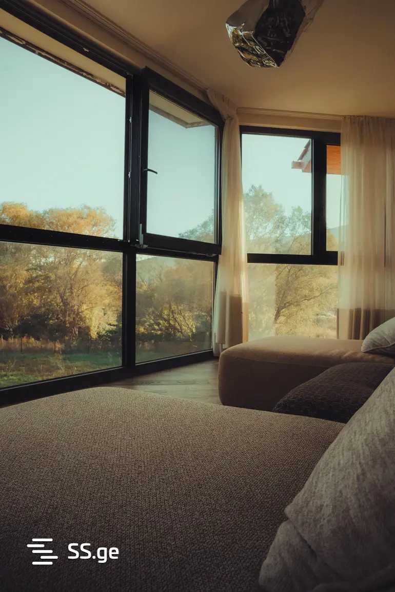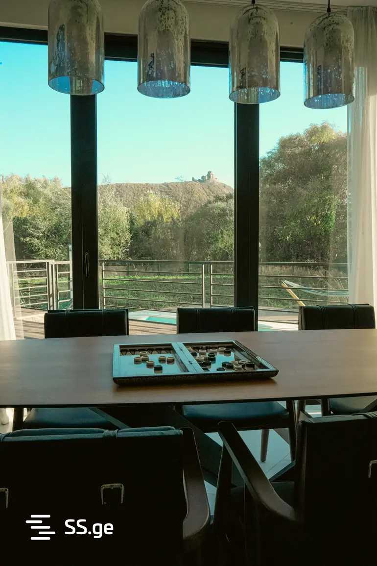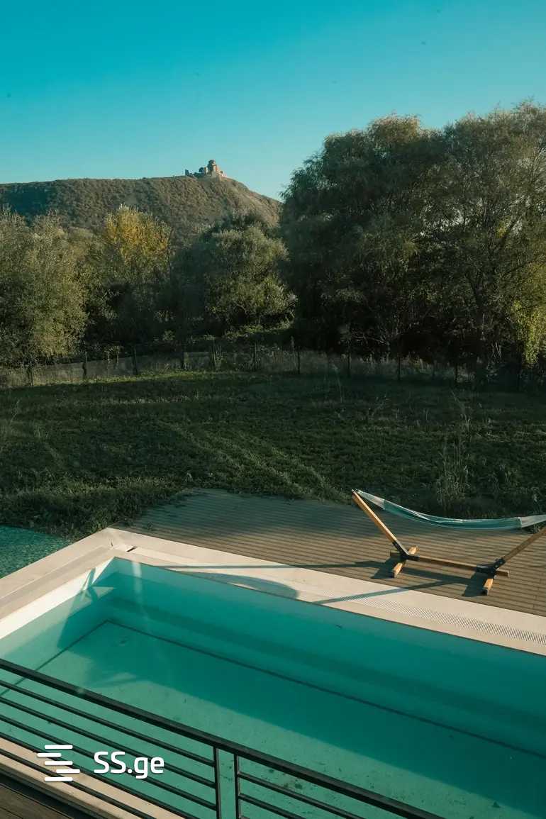 In Mtskheta, in the most prestigious and protected settlement - Riverside, an outstanding house is for sale, which is located only 15 minutes from Tbilisi. The house is built with the highest quality materials and modern, top quality renovations. Features: Three floors, one floor (minus) is reserved for a cozy living room with a fireplace. On the first floor there is also a living room and a kitchen, from which there is a direct exit to the pool, and on the top floor there are bedrooms. The house has a spacious and quiet yard, which is located on the last plot, which ensures maximum coziness. This unique home is ideal for those looking for comfort, quality and a unique living environment.