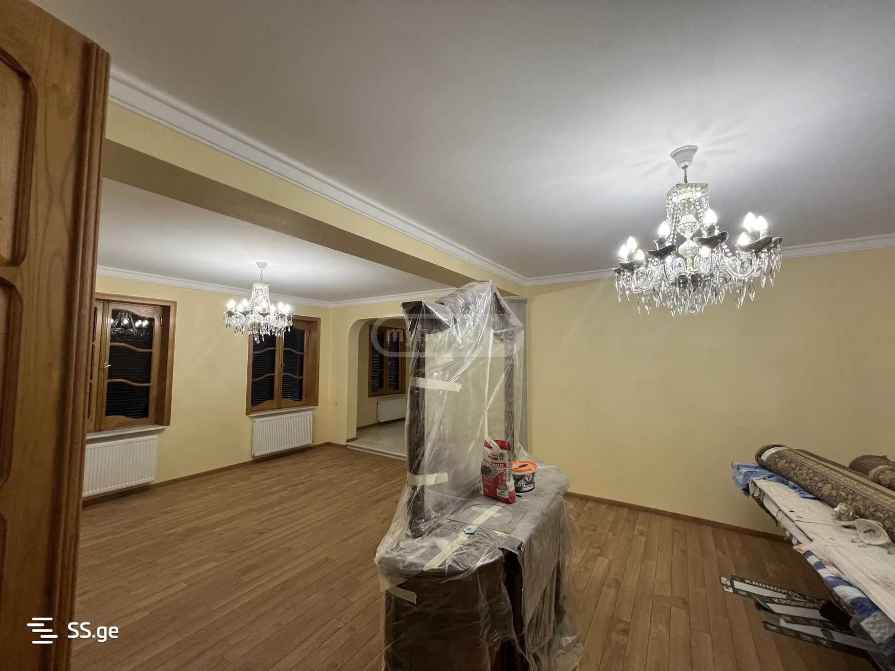 The land area is 660 sq.m. The entire house is newly renovated and for sale with furniture. In the yard, there is a separate building with a fireplace measuring 40 sq.m. There are three floors: on the -1 floor, there is a cellar, a large hall with a fireplace, a bathroom, a kitchen, and a laundry room. The 1st floor has a living room, a fireplace, a kitchen, a bathroom, and an office room. On the 2nd floor, there are 4 large bedrooms, one bathroom, and 2 verandas.