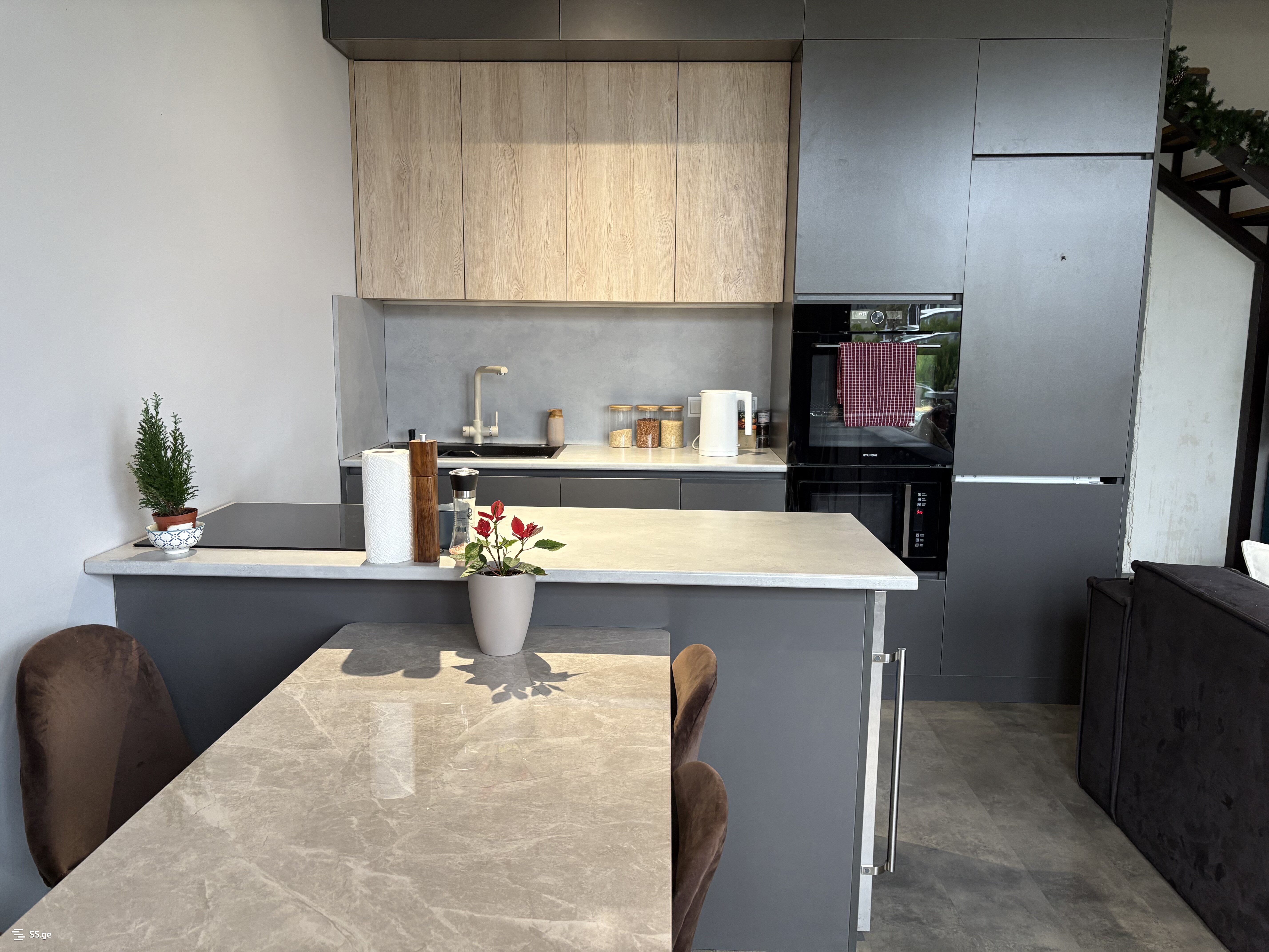 The house has a large living room, a kitchen with an island, all the convenient drawers and cabinets, a built-in refrigerator, a dishwasher, an oven, a microwave, a wine fridge, an induction cooker (gas was not brought inside the house, so it is more peaceful to sleep, and induction is faster and more convenient to use).