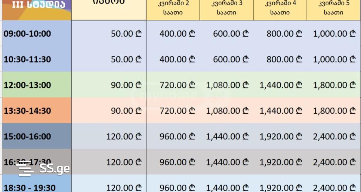 A clean, newly renovated rehearsal hall with a high ceiling is for rent by the hour (prices are indicated in the table), or in full (5000₾ per month). It has two changing rooms, a wardrobe, a waiting area for parents, two toilets.