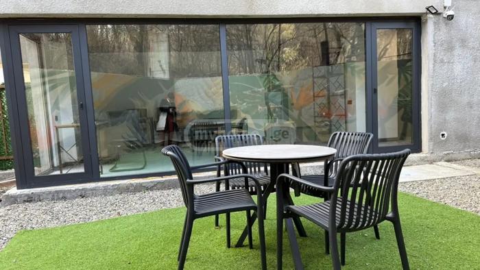 For urgent rent! Bright commercial/multifunctional space for rent in Saburtalo with individual yard (Beritashvili #19). The area is located in the city center, between the Medical Metro and Lisi Lake, on the ground floor of a 7-story building (entrance from the stairwell). The area is partitioned at this stage and has a separate office as shown in the photos. It is suitable for office work and other commercial activities. (It is the inner side of the building and not facing the road) Total area is 61 square meters, separate kitchen 7 square meters, bathroom 5 square meters. The space also has a beautiful individual yard of 50 square meters. The price is 790 US dollars per month.