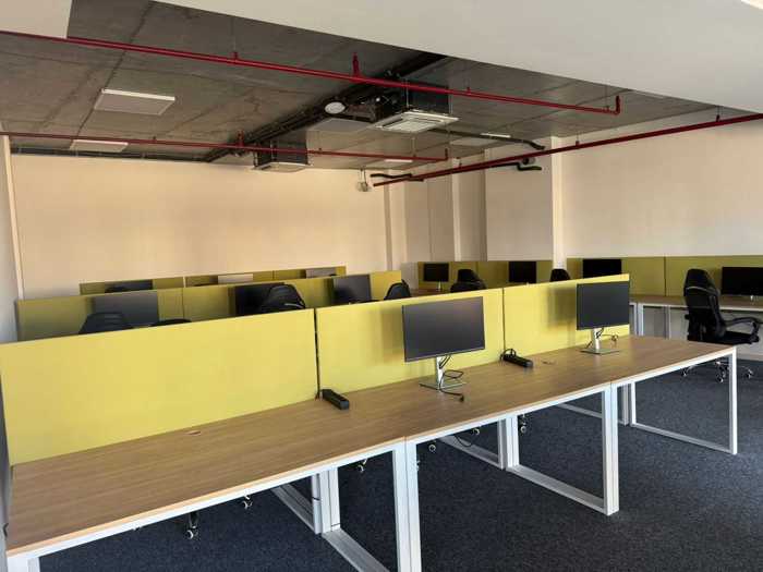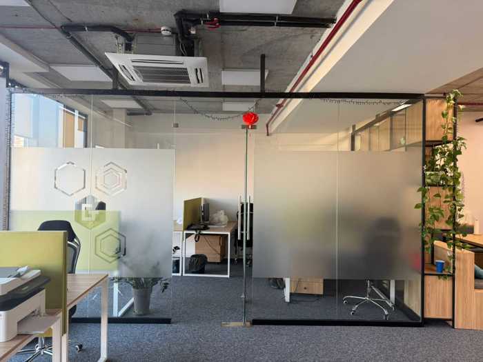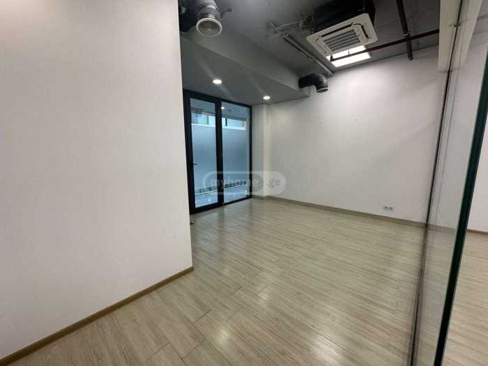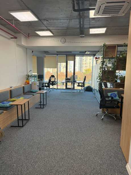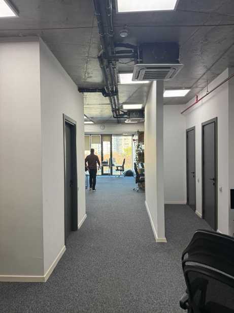 Office space for rent in the Atrium Business Center. The building has parking space where payment for parking is made through a sensor device, a food establishment, relaxation areas both inside and outside, a veranda, restrooms, 24-hour security, cameras, passenger and freight lofts. The space has internet, heating, hot water, a camera at the door, and the area is divided by glass partitions.