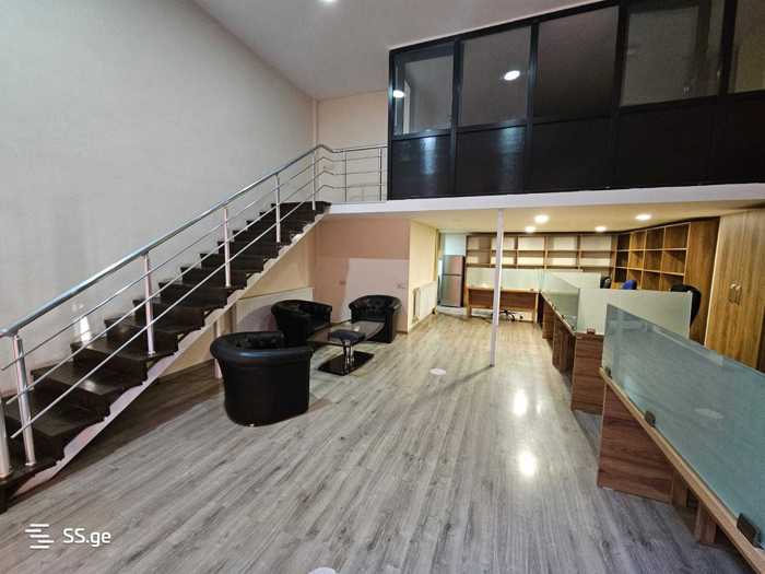 At 7 a Sotne Dadiani, behind the shopping center "Karvasla", with 2 restrooms, central heating, air conditioning, and office furniture. The area is 58.5 m3 + mezzanine 28 m.