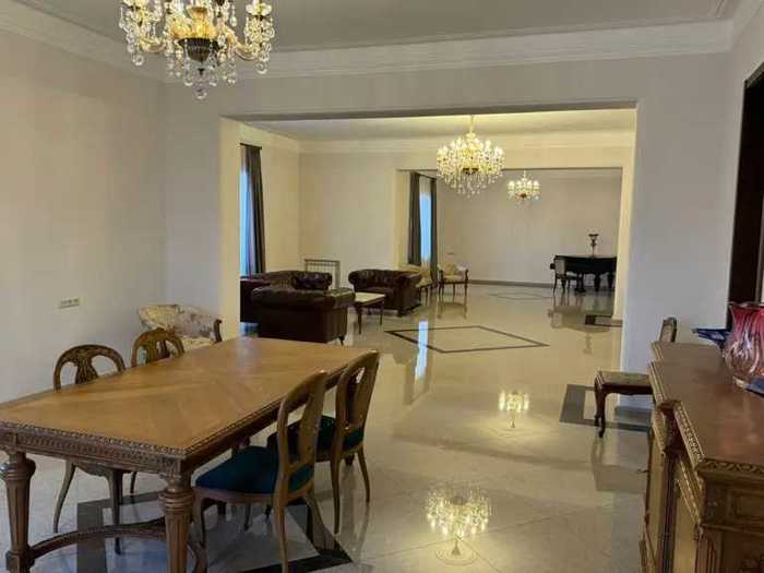 A four-story house is available for rent on I. Machabeli Street in the Walnut District, with a total area of 1450 m2. The yard area is 2000 m2. The yard features both a decorative garden (in front of the house) and fruit-bearing trees. There are four bedrooms (with integrated wet rooms, two bedrooms of 80 m2 each, and two of 25 m2), a kitchen of 35 m2, an office of 35 m2, a living room of 120 m2, a hall of 150 m2, two garages for three cars, one conference room of 300 m2, and plenty of additional space. Each room has a large balcony and the house also has a large veranda.