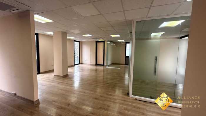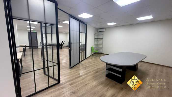 Office space of 170 sq/m for rent in a modern business center in Saburtalo. The space includes both cabin and open areas.