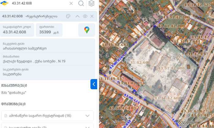 Commercial space for sale (cadastral code: 43.31.42.608) (SoftTechnika) in Zugdidi, on the central highway. Address: Sokhumi Street N79. Area: 1.2 hectares (12,000 sq.m) The buildings located on the plot are rented out and are commercially profitable. The land plot borders on two sides by central streets, Sokhumi Street and Ilia Chavchavadze Street (Faifuri Road). For details, contact: Giorgi 568 331 247 Lasha 599 174 411