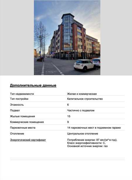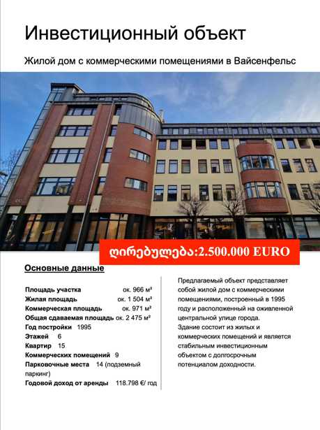 For sale is a 6-story building. The property is located in Germany, in the city of Weißenfels, offering a safe investment opportunity in a rapidly developing city. Weißenfels is situated approximately 41 km southwest of Leipzig. The annual income from renting is €118,798/year. The building, constructed in 1995, includes 15 apartments and 9 commercial spaces, as well as an elevator and a 14-space underground garage. The apartments and office spaces are in good condition. The rental area is approximately 2,475.53 m². The tenants include general practice doctors, a continuing education academy, and a therapy center. The residential space ranges from 45 to 123 m². The property is located on a busy street, making it ideal for shops and businesses. There is also ample parking in the underground garage. The building has a basement and is equipped with gas central heating and central hot water.