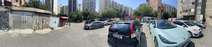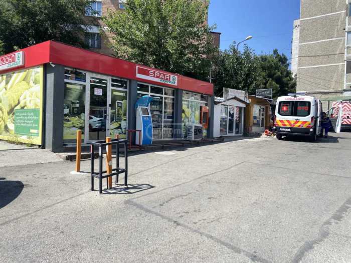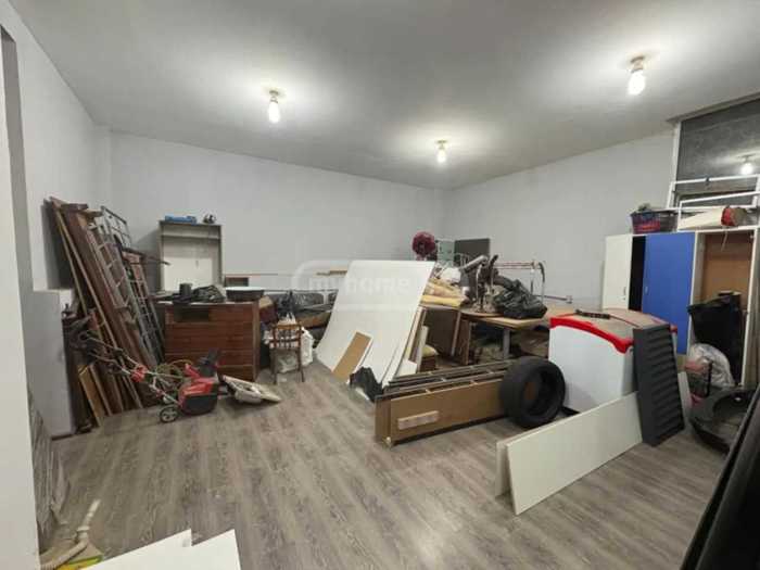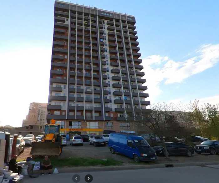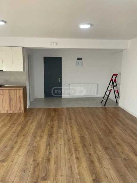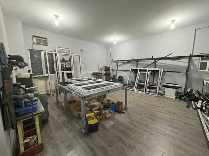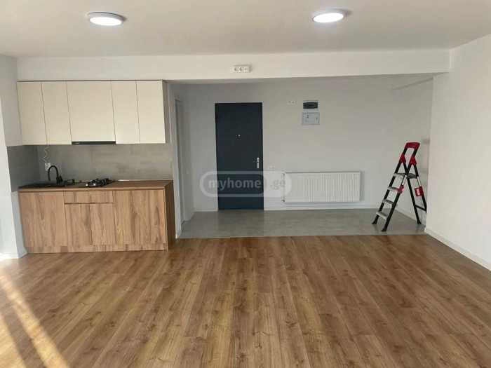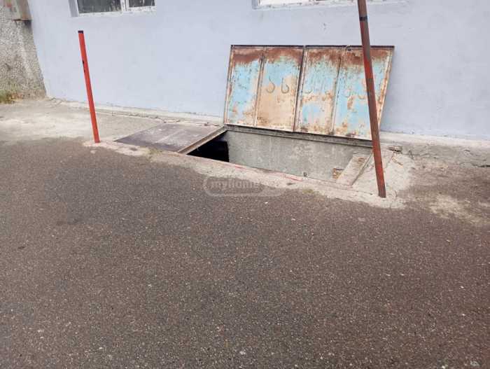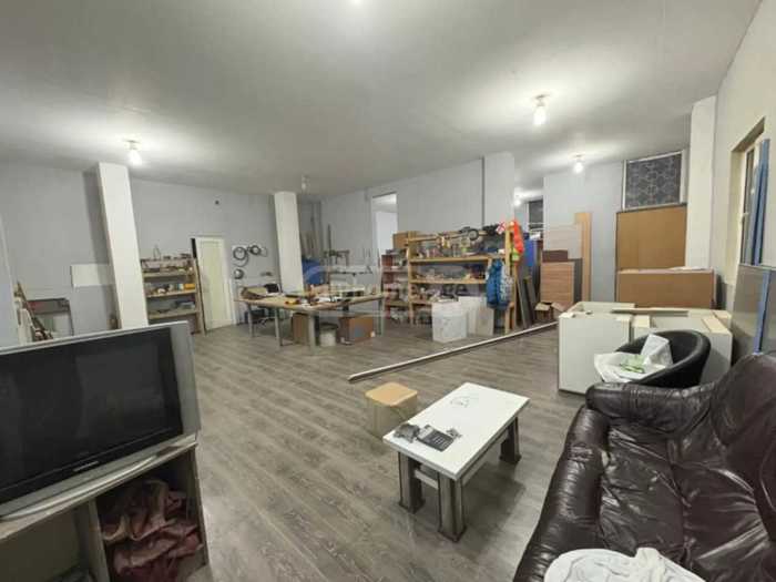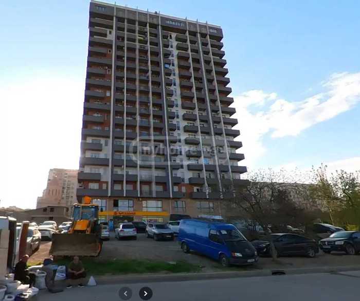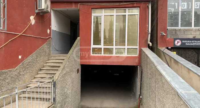 Commercial spaces with stained glass are for sale in Didi Dighomi, at 48 Giorgi Bzrtqvale Street, in a newly built residential building. Another 2,300-apartment building is being constructed in front of it. The floor is in black frame condition, meaning it's concrete, while the walls are plastered with gypsum.