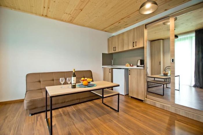 A hotel-type 2-room apartment for daily rent, in the center of Bakuriani in "Park Residence" directly on the 25th street, the best location with parking, with the best conditions.