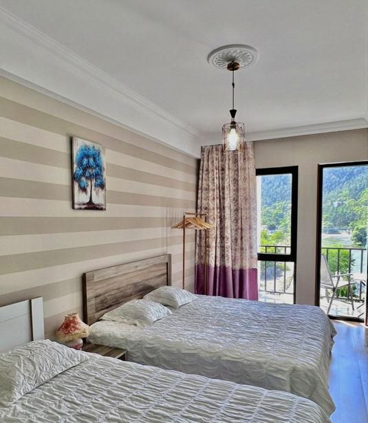 In the center of Borjomi, a newly built 6 (8-bed) apartment of 65 sq.m. is for rent. With full equipment and superior comfort. Equipped with all necessary equipment and inventory. The apartment has two bedrooms, 1 bathroom, living room, folding sofa. Extra equipment: TV, refrigerator, gas stove, washing machine, central heating, hot / cold water, wireless internet, furniture, household items, dishes. The apartment also has a beautiful view overlooking the beautiful mountains.