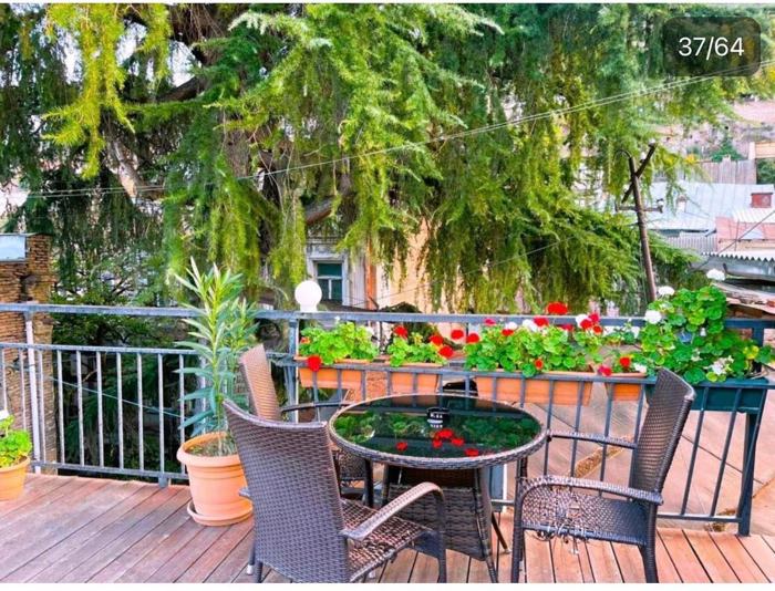 The apartment is in the most active tourist area. It has a veranda with beautiful views of Old Tbilisi. It has three bathrooms. Kitchen. It is close to Shardeni, Meydan, Rustaveli Avenue.