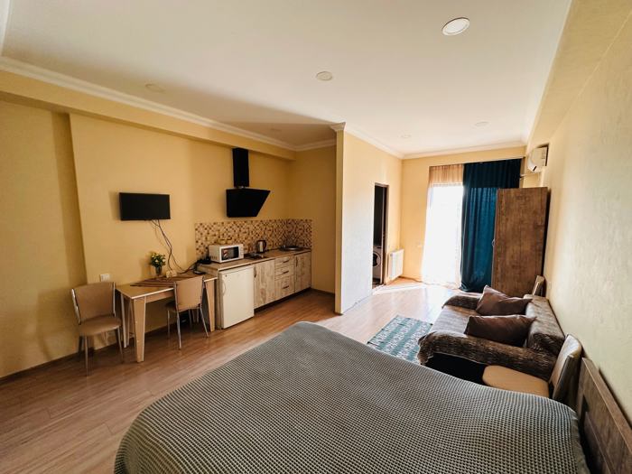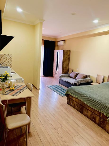 For rent daily in a newly built building. A hotel-style 2-room apartment. With the latest modern design interior. Furnished with new furniture and all kinds of appliances, equipped with new bedding, towels, and all necessary kitchen items. With WiFi internet and TV. Price up to 40-100 GEL.