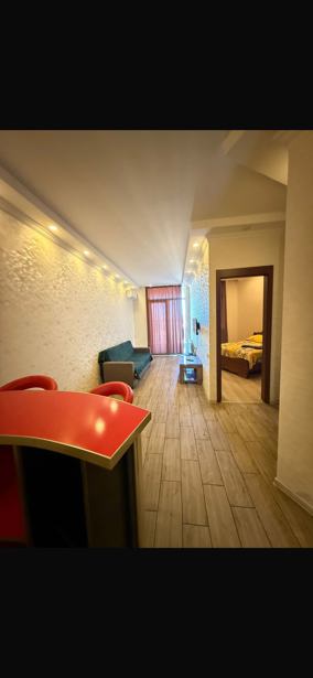 Disinfection takes place during every cleaning! Always very clean! Newly renovated. It is equipped with a comfortable orthopedic bed, air conditioner, WIFI, Magti TV, disposable slippers, shower gel, shampoo, soap, clean bed linen and towels. The apartment also has a TV, refrigerator, washing machine, stove, dishes. A 2-room newly renovated apartment with an area of 50 sq/m is for daily rent. In June, cozy, bright and clean. Price: from 30 GEL.