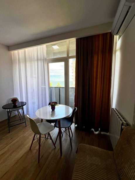 For rent in Makhinjauri on Jinjharadze Street, in a newly built building (in the Next house) on the 9th floor, with a sea view, a two-room apartment with one bedroom, renovated, with furniture and appliances, with floor heating. Price: 350 USD.