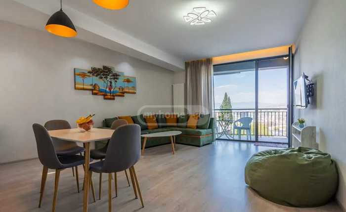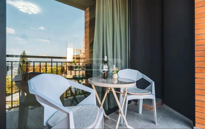 For rent: a renovated apartment in a newly built building. Near Mtatsminda, close to St. David's Church, on Polikarp Kakabadze Street. With a view of the city. The apartment is furnished with all kinds of furniture and appliances. Restrictions: no smoking in the indoor space, no pets, Indians, Arabs.