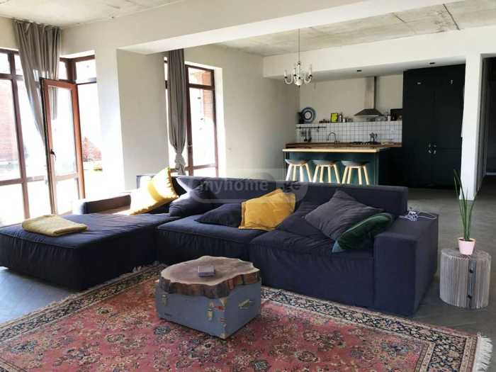 For rent, an apartment in Vake. The apartment is 177 sq.m and has a private yard of 300 sq.m. It has 4 rooms, 3 bedrooms, 2 bathrooms, a laundry room, and an outdoor storage. The apartment is equipped with all necessary furniture and appliances, central and underfloor heating. The area is served by a 24/7 security service.