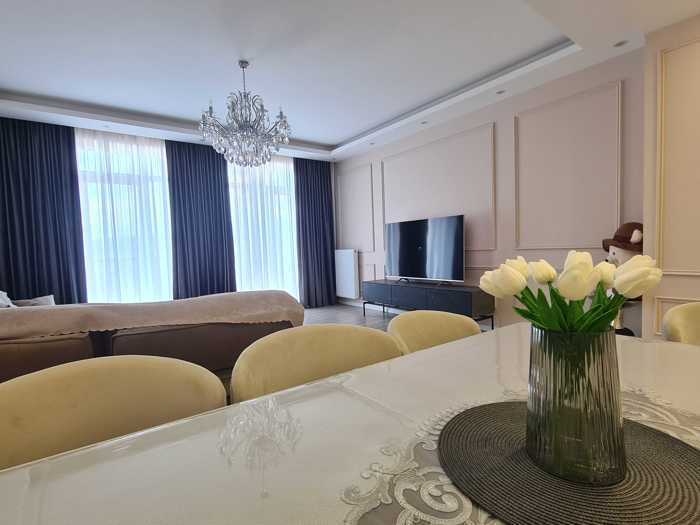 For rent is a newly renovated 3-room apartment on Beritashvili Street, with 2 bright bedrooms, separate kitchen, and 2 balconies. The apartment has a beautiful panoramic view of the city and is 125 square meters. The apartment is furnished with all necessary furniture and appliances - refrigerator, washing machine, TV, air conditioner, storage (wardrobes). Rent is with two months advance payment. Price - $1000