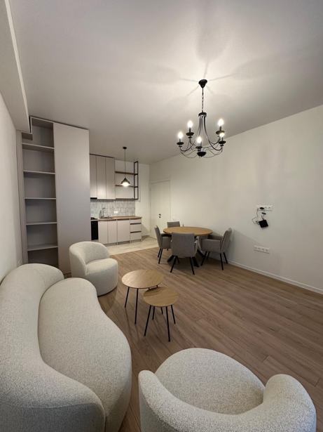 For rent is a newly renovated, uninhabited apartment on Zhiuli Shartava Street, in the White Square building. The apartment is equipped with all necessary appliances and "Ishlis" furniture, with a view of the city. The building's cleanliness is ensured by the service company, the entrance is locked and well-maintained.