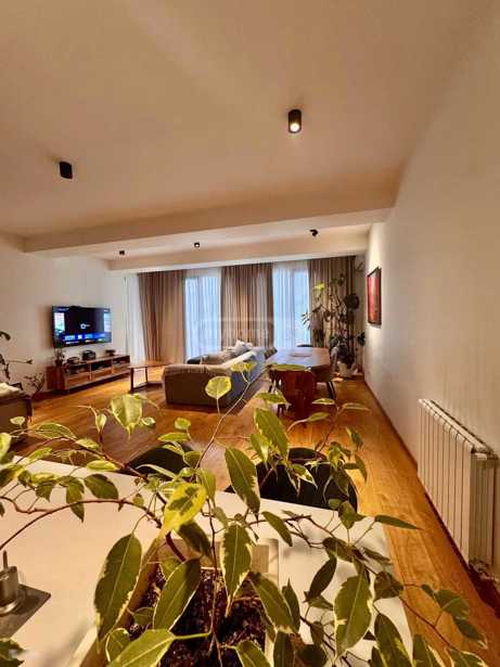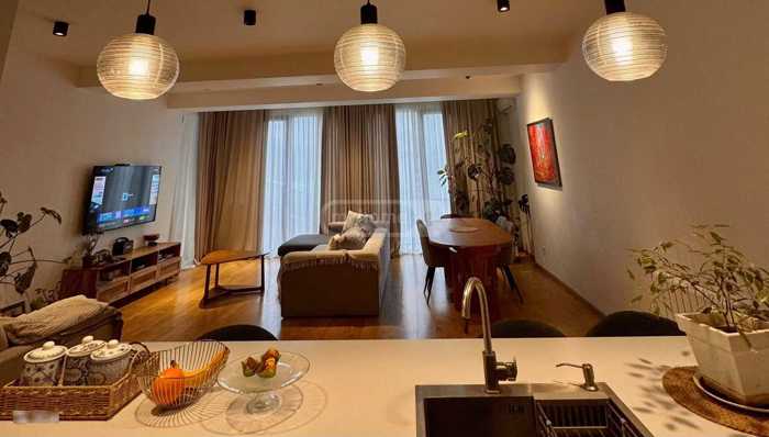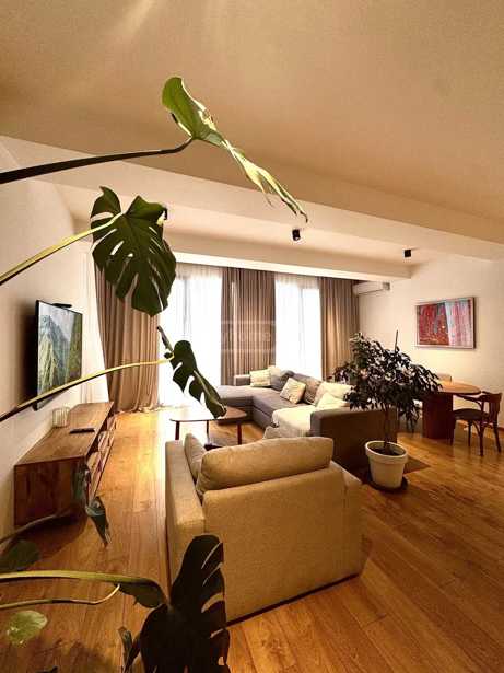 An apartment located near Vake Park, in an ecologically clean environment, on a quiet and peaceful street covers an area of 64 square meters. The residential building with modern architecture features a clean, well-maintained, and secured entrance. The building is equipped with wide stairs and a modern elevator. The apartment is situated on the 3rd floor of an 8-storey building. The layout includes a hall, a studio-type living room, one bedroom, one wet area, and a spacious balcony accessible from both rooms. The interior is tastefully furnished and completely comfortable. The apartment is equipped with furniture and appliances: central heating, a dishwasher, an oven, and air conditioning. Vake Park is located just a 2-minute walk from the house. Public transport stops, as well as Abashidze Street and Chavchavadze Avenue, are nearby.