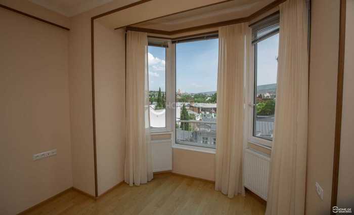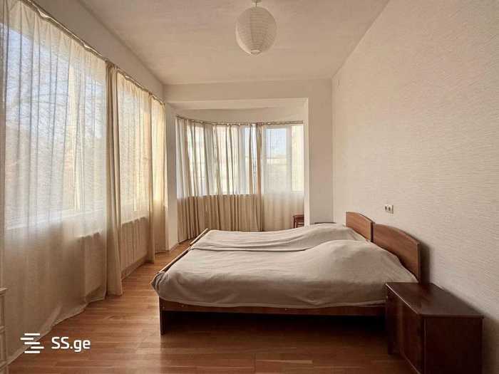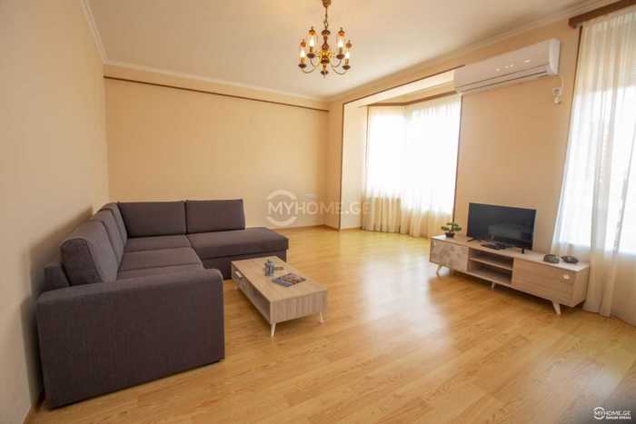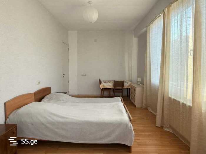 For rent, a 100 m² 3-room apartment near Marjanishvili Theater for foreigners. Renovated. With a balcony, two bedrooms (each bedroom has an independent air conditioner), two bathrooms. With a studio-type living room (with an independent air conditioner) in a common parking area, in a fenced yard with a barrier.