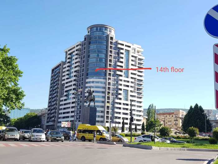 For rent in Saakadze Tower, at Saakadze Square, a 3-bedroom apartment with 2 bathrooms. 1 bedroom has secondary lighting but is equipped with air conditioning. 14th floor with a view of the square for $1300.