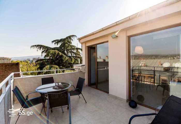 A newly renovated apartment is for rent in the city center on the former Pervoskaya Street. The apartment has 2 bedrooms, a large living room, and a dining area with access to a terrace. It offers stunning views of the Mtkvari River's left bank and Mtatsminda. The apartment is equipped with all kinds of modern amenities.