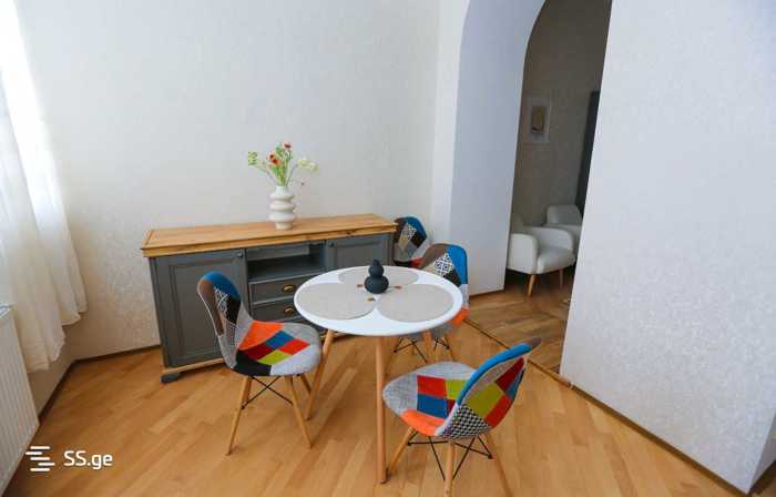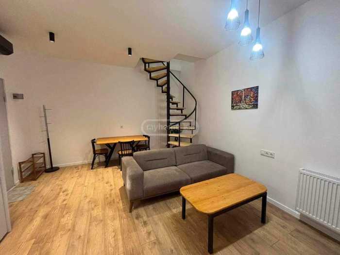 A newly renovated duplex apartment fully furnished is for rent in a house on Tabukashvili Street N14, in a quiet yard with historical and cultural heritage status, equipped with a dishwasher, with a bedroom downstairs featuring a double bed, and also two single beds on the upper floor.