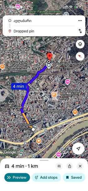 An apartment is for rent near the Avlabari metro station, on Saingilo Street. Also, there is a stop near the house where transport runs. The apartment comes with all the furniture and appliances shown in the photos. Additionally, there is another large bed, and the sofas can also be unfolded. Heating - gas and electric. I have no restrictions on nationality. Payment in advance for 2 months.