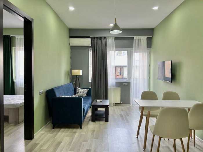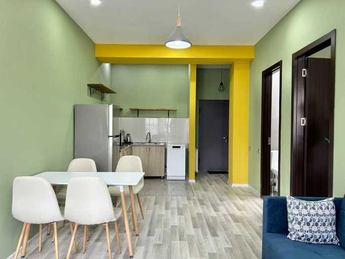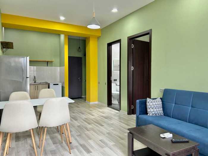 For rent is a 2-room newly renovated apartment in Bagebi, in the Domusi residential complex. The monthly cost of the apartment is $550 if you rent for 12 months. If you rent for 6 months, the cost of the apartment is $600.