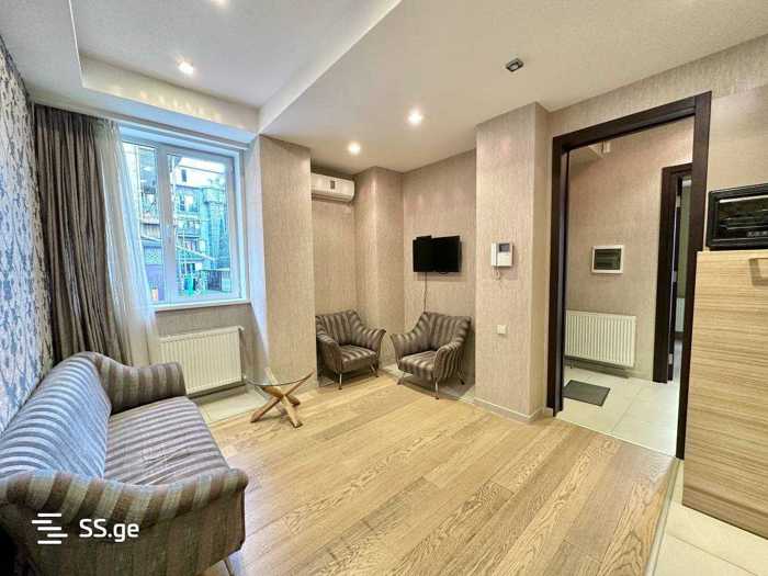 Please contact me by WhatsApp +995557562454. I don't cooperate with agents. Spacious 2 rooms apartment (1 bedroom) in New building close to Park Vake, 2 balconies. Newly renovated! Now on last steps of furnishing. Only for long term. Parking place in underground parking possible to rent from additional payment.