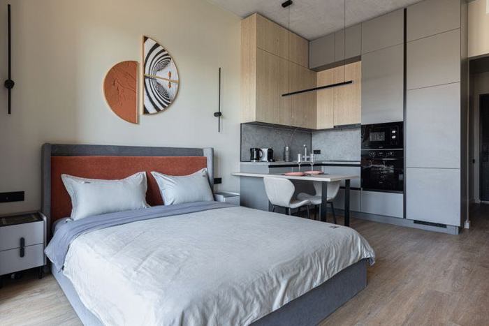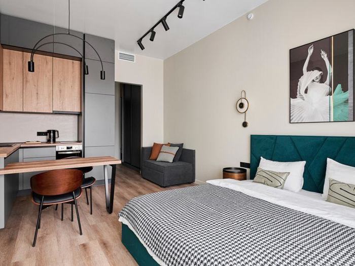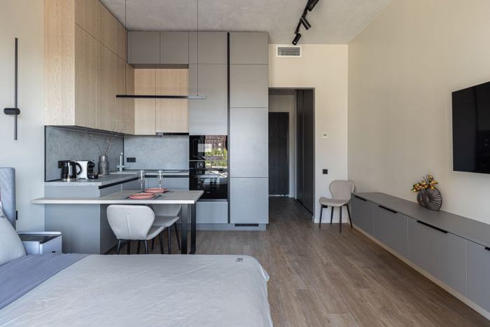 #for rent 1+1 Elegance Horizontal with central heating for a year for $400. Second dead-end Angisa 11 Modern residential complex with high-speed Japanese elevators and security. The apartment has a work desk, plenty of storage space. 10th floor 45 sq.m $400