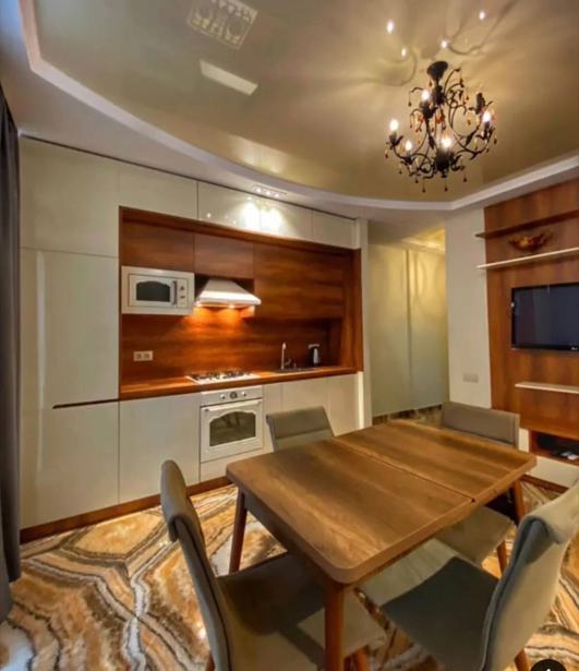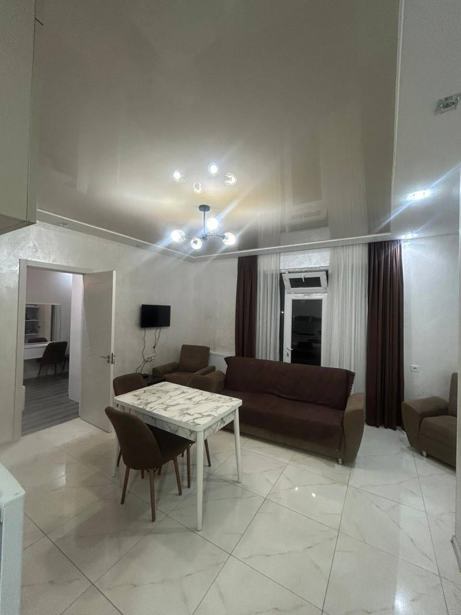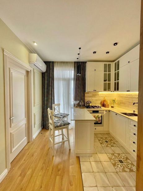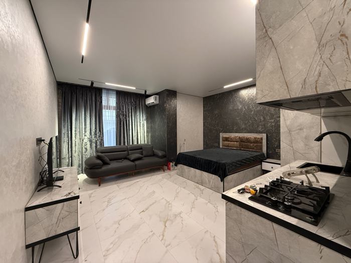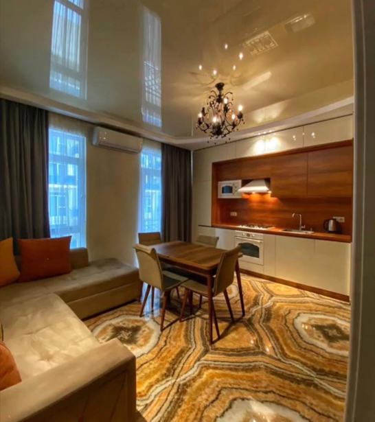 A newly renovated premium-class apartment is urgently for rent until the summer, located in the most prestigious place in Batumi, at the intersection of Rustaveli and Vaja-Pshavela, near the prestigious Sheraton hotel, 100 meters from the sea, on the 5th floor of a newly built building. The 67 sq.m. studio-type apartment has two bedrooms, one of which is separately isolated. The apartment is equipped with all necessary high-quality items and appliances. Each room has a balcony with beautiful views of the boulevard.