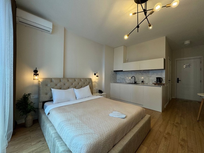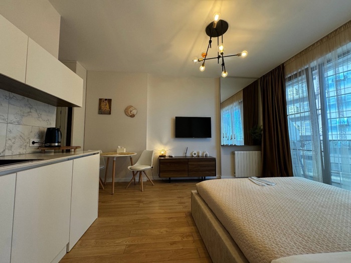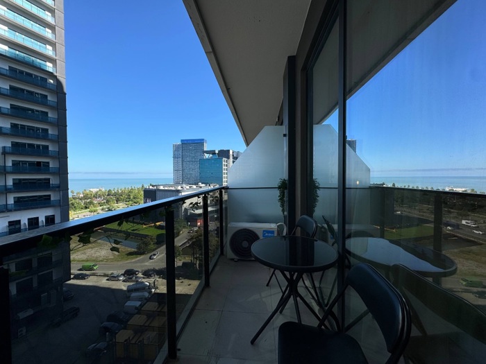 Studio with a view of the Black Sea in the modern residential complex STEPS on the New Boulevard. The sea, the promenade and the best casinos of Batumi are within a 3-minute walk. — Comfortable double bed with fresh linens and towels — Fast Wi-Fi and Smart TV — Equipped kitchen — Air conditioning, washing machine, iron with ironing board — Balcony with sea view — Welcome kit with everything you need for a comfortable first day It is rented daily and monthly. Write to us and we will clarify the available dates and answer your questions.