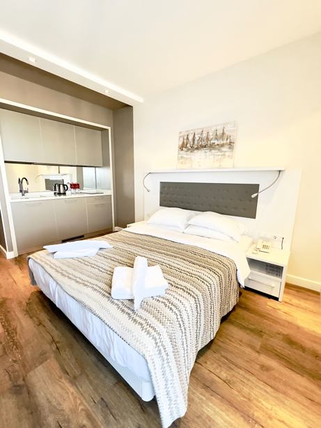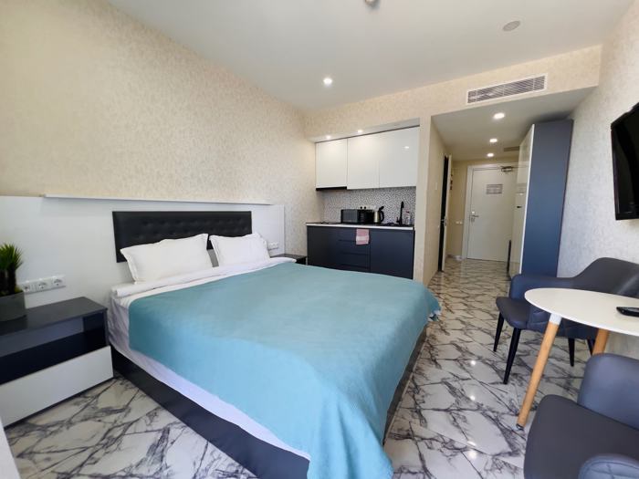 Cozy 1-room apartments for rent in Batumi (Orbi City hotel complex, 7d, Sherif Khimshiashvili St., Block 'C', with a view of Turkey), located on the 9th floor of a 50-story building. The apartments are additionally equipped with everything necessary for long-term stays of guests. 🍃🏖 The hotel complex is situated in an ecologically clean, green area with a beautiful park, 70 meters from the sea, on the first coastline, in the very center of the New Boulevard. 🛏🛋🍽 The room is furnished with a king-size bed, a sofa bed, an electric stove, a dresser, and a full set of dishes for 4 people. 🧊♨️🔐 The room is also equipped with a large refrigerator with a freezer, a microwave, a workspace with a comfortable computer chair, a built-in safe, a dresser, a washing machine, an energy-saving oil heater, extra lighting in the kitchen area, and balcony furniture. 🏝⛰⛲ The apartments offer a magnificent view of the sea and mountains, with a 24-hour reception service in the building, 12 high-speed elevators, numerous shops, cafes, bars nearby, and within walking distance of the largest shopping center in Batumi 'Grand Mall'. 💲 The price is $300 per month plus utility payments (water and electricity). ⏰ Payment for 1 month upon check-in, then monthly. Rental from 1 month to 6 months.