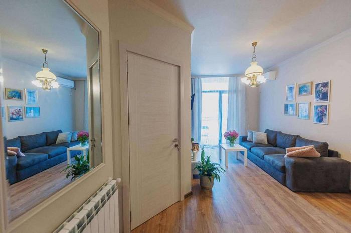 For rent for a year or more, a comfortable and cozy apartment with the best view on the floor: direct view of the sea and the boulevard, side view of the mountains, the city, the lake and the dolphinarium. Fully equipped and equipped for a long stay: bathroom with washing machine, electric dryer and hairdryer, shower room with sliding door, kitchen with kettle, electric stove, toaster, induction hob, microwave and large refrigerator. Expensive furniture, high-quality linens, dishes and appliances, cozy armchairs with a table on 2 balconies, 2 55-inch TVs, Internet, 2 storage rooms, a large double bed and a folding sofa - all this fully corresponds to the conditions of comfortable living for a family of 2-3-4 people. And finally, the most important thing: an ELECTRIC UNDERFLOOR HEATING is installed in all rooms of the apartment except the balconies, so you are unlikely to freeze in it in cold weather. It is rented for a year or more for $ 1300 per month, payment for the first and last at the conclusion of the contract, plus utilities.