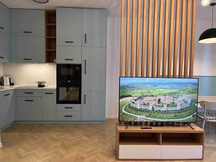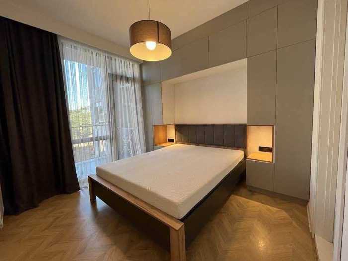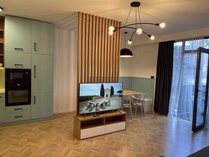 The apartment is located in the city center, near the central park. It has an isolated bedroom and a studio where the kitchen is separated by a bar. The apartment has been renovated with high-quality materials, has wooden flooring, and is equipped with Bosch appliances. The apartment is cozy and bright.