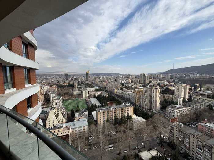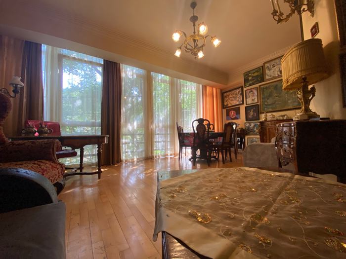 The apartment is located 1 kilometer from the beginning of Chavchavadze, a 15-minute walk away. Javania Street is not a thoroughfare, so cars rarely travel through it and the area is extremely quiet at any time of the day. The building is a very beautiful project. The apartment itself is light and airy, with balconies/porches on both sides. On one side, there is an additionally landscaped isolated yard (the yard is part of the apartment; see the excerpt from the registry). Beyond the yard, there is also a large additional landscaped space that is isolated, has no access road for vehicles or pedestrians, and where nothing will be built in the future, thus the apartment essentially has an additional large landscaped space. The apartment was intended for myself, and I renovated it with high-quality materials. The bathroom is finished, with top-of-the-line aluminum windows, Hansgrohe and Gerberit bathroom furniture, faucets, etc., an LG high-quality air conditioner, and high-quality central heating. If additional funds are added, two parking spots can be added as well. Apartment dimensions: 1. Clean living area: 96 sq.m. 2. First balcony: 35.5 sq.m. 3. Second balcony 16 sq.m. 4. Basement under the second balcony 13 sq.m. 5. Landscaped yard: 65 sq.m.