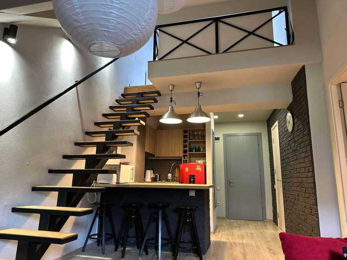 For sale in Gudauri, a renovated apartment of 56 square meters, of which 14 square meters is a loft, with 2 bedrooms, a studio-type living room, 2 bathrooms, and is permanently rented out during the season.